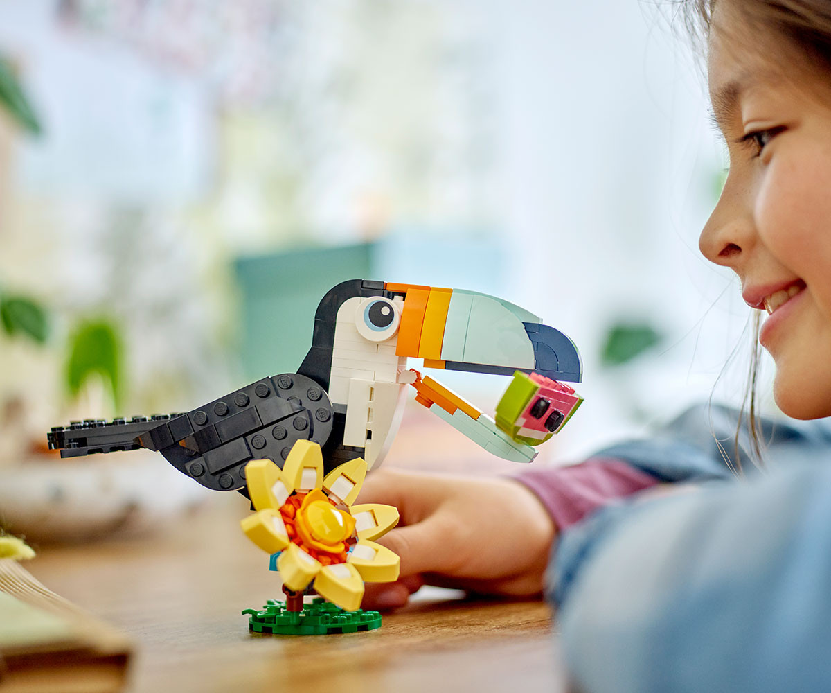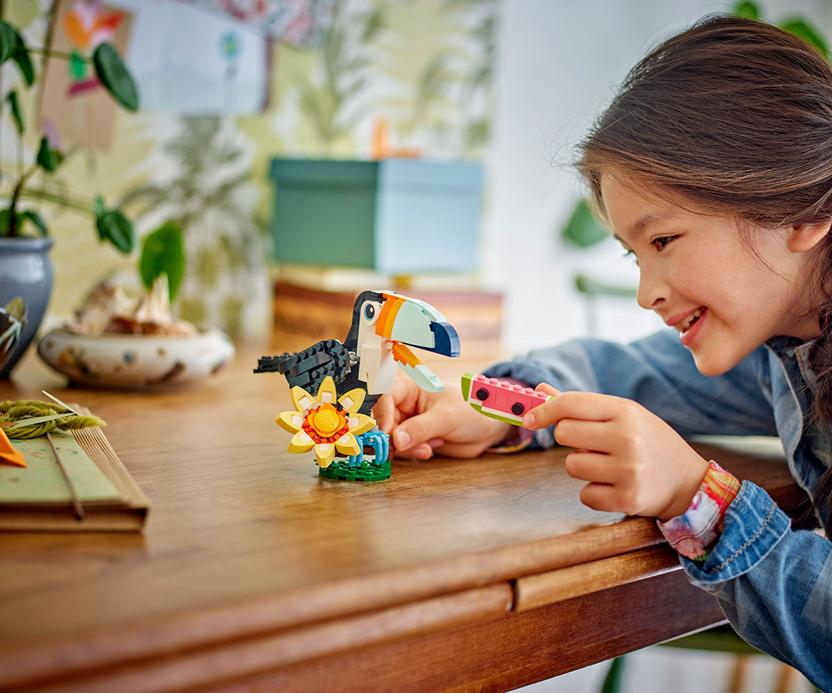 - 3 възможности за построяване на тропически животни в 1 кутия – комплектът LEGO® Creator Диви животни: Тропически тукан „3 в 1“ позволява на момичета и момчета на възраст над 7 години да строят и променят 3 комплекта с животни с едни и същи тухлички;