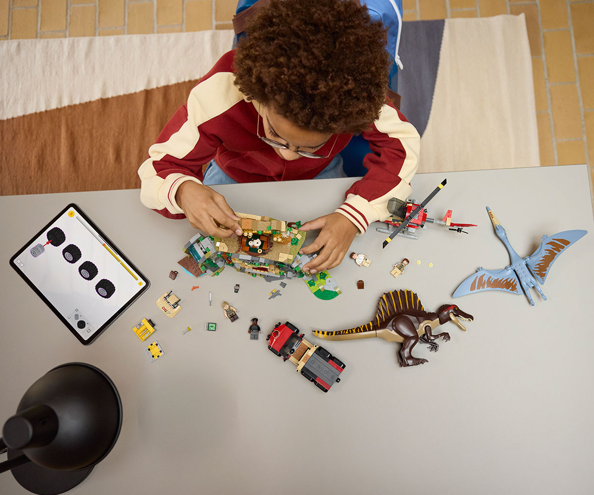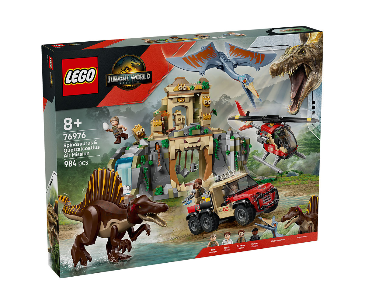Приключенията с динозаври очакват деца и фенове на възраст над 8 години в този интерактивен комплект LEGO® Jurassic World „Въздушна мисия със спинозавър и кетцалкоатлус“ (76976). Вдъхновеният от филма подарък с динозавър за момчета и момичета включва 2 отлети фигури на динозаври от Jurassic World Rebirth и 4 филмови герои: Мартин Кребс, Зора Бенет, Дънкан Кинкейд и д-р Хенри Лумис. Спинозавърът има подвижни крака, ръце, опашка, глава и челюст. Кетцалкоатлусът има движещи се крила и челюст. Освен това има древен храм с водопад, капан с падащи брадви, срутващи се колони, гнездо и яйца. Има и хеликоптер, камион, куфар за спринцовки, 3 спринцовки и др. Децата и възрастните ще харесат водния динозавър и летящия динозавър в строителен комплект, който се комбинира с други от гамата LEGO Jurassic World (продават се отделно). А приложението LEGO Builder насочва децата по време на интуитивното строително приключение, като им позволява да мащабират и завъртат модели в 3D, да запазват комплекти и да проследяват напредъка. Комплектът съдържа 984 части.