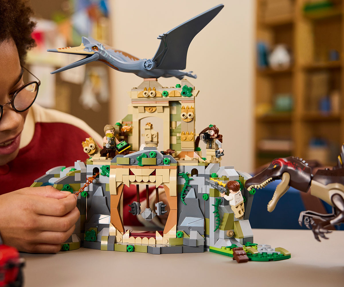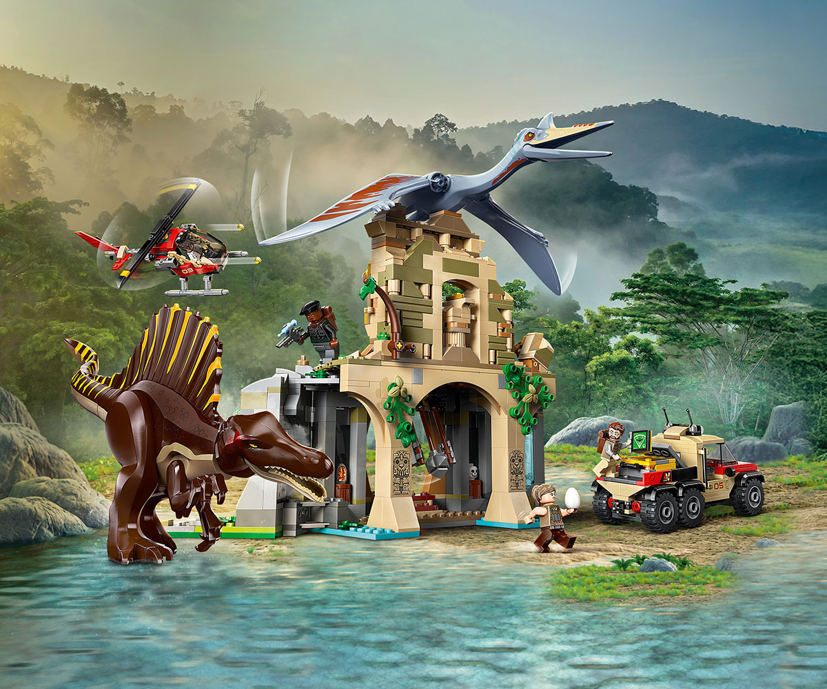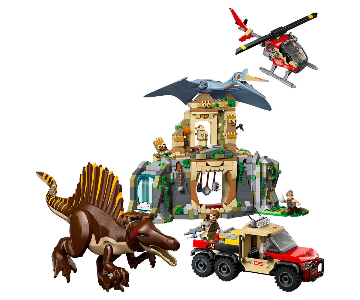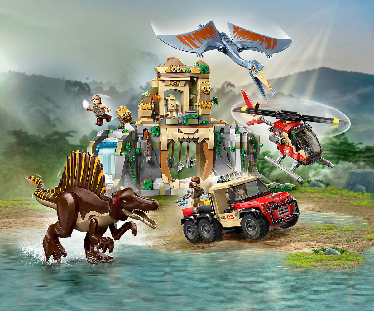 Вдъхновете феновете на откритията и приключенията с комплект LEGO® Jurassic World с 2 фигури на динозаври, храм, 2 превозни средства, 4 минифигури и др.