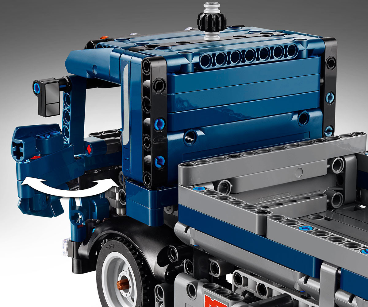 Поддържайте нещата в движение на строителната площадка с този самосвал LEGO® Technic! Позиционирайте камиона. Завъртете копчето отстрани на камиона, за да наклоните каросерията. Отворете вратите, за да погледнете вътре в кабината, след което закарайте неуморния камион до следващата му задача на строителната площадка.
