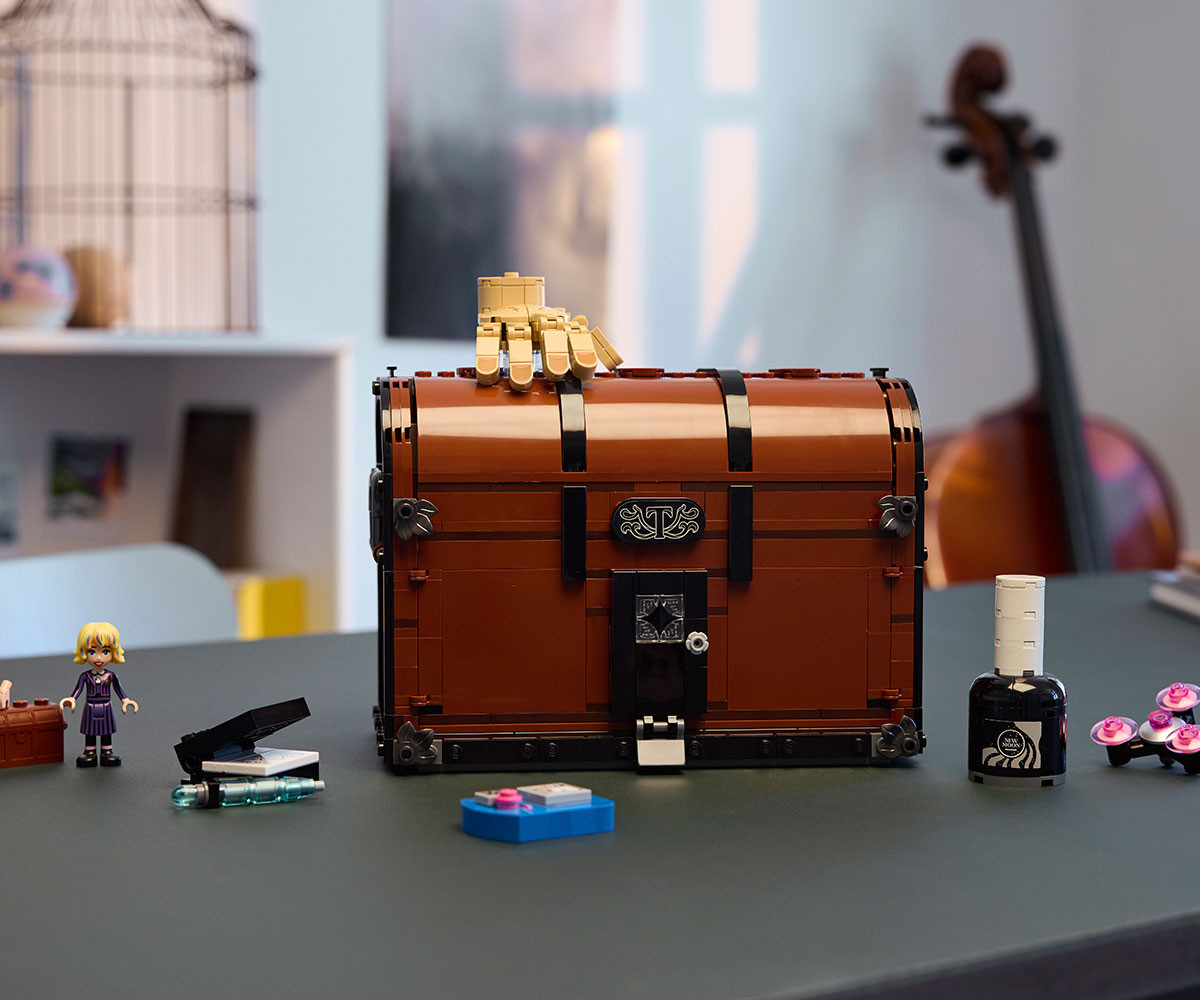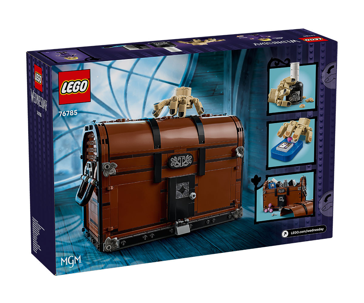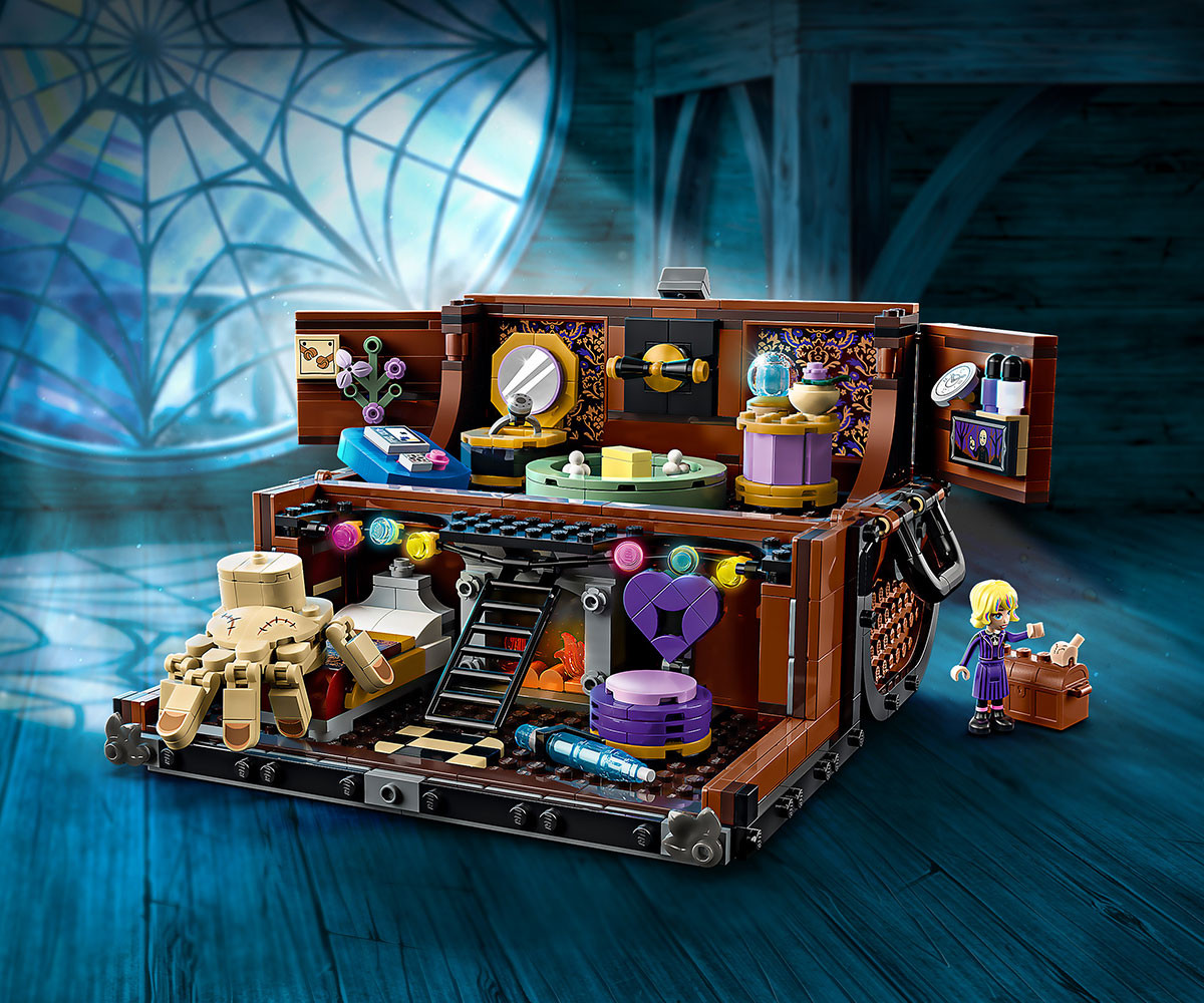 Разгледайте новия апартамент на Нещото! Създайте уютен преносим дом в този отварящ се сандък за построяване. Сложете мебелите и другите предмети, запалете огън, докато Нещото се освежава след поредното приключение с Уензди, а после заедно с Инид поглезете Нещото с нов лак за нокти. Пишете, играйте видеоигри или се отпуснете. Накрая затворете сандъка за забавен експонат. Домът е там, където е сандъкът на Нещото.