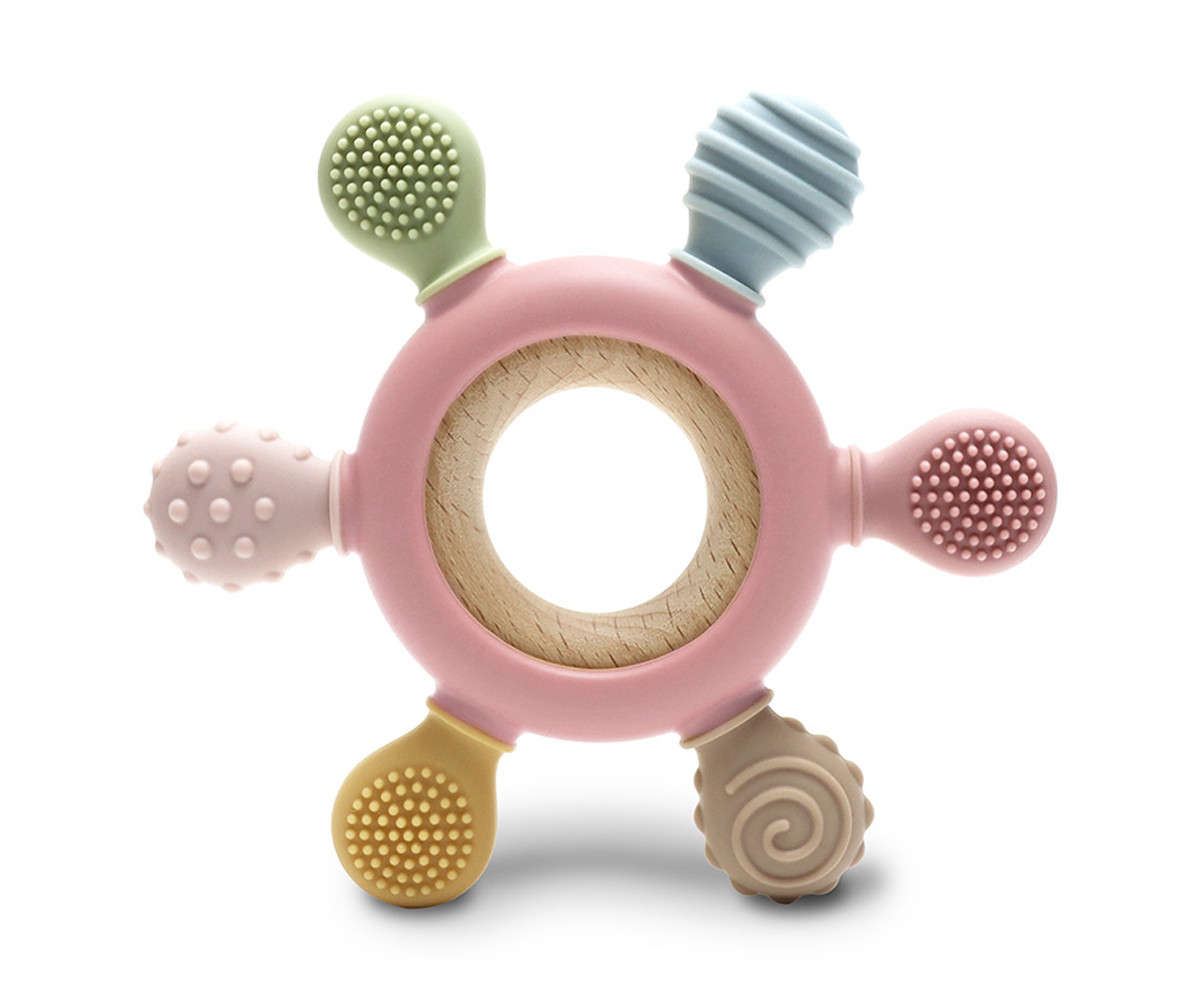 Изработена от силикон и букова дървесина. Перфектна за масажиране на нежните венци на бебето в периодa на растеж на млечните зъбки. Леснa за хващане.