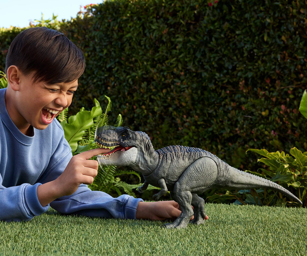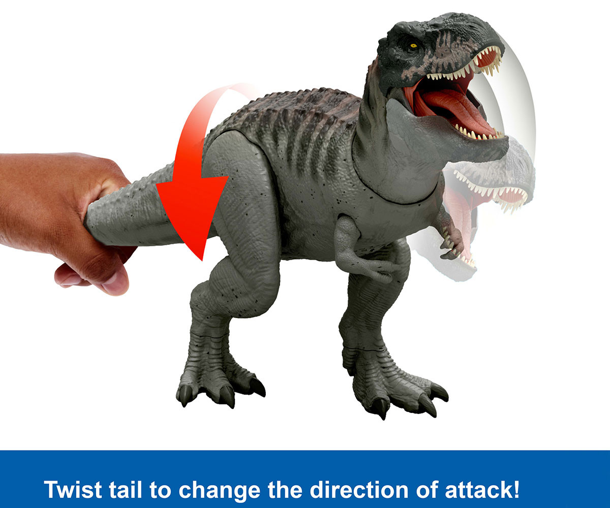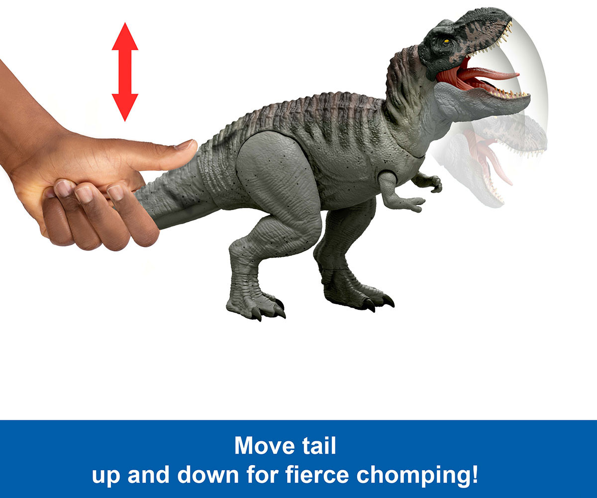 Тиранозавър Рекс, вдъхновен от Jurassic World Rebirth, идва с яростна функция за многократно захапване! При натискане на езика се чува първичен победоносен рев. Ако езикът се задържи по-дълго, се активира свирепа поредица от непрекъснати захапвания със светлинни и звукови ефекти! Тази функция осигурява вълнуващи битки, докато T-Rex напада други фигури-динозаври (предлагат се отделно)! Чрез движение на опашката главата може да се движи нагоре-надолу или настрани, докато огромната челюст остава широко отворена! Сканирайте Tracking Code на крака на динозавъра в безплатното приложение Jurassic World Play App със съвместимо смарт устройство (Android или iOS, не е включено), за да отключите дигитална версия на динозавъра и да играете увлекателна игра с надпревара по суша, въздух и вода. Идеален подарък за фенове на динозаври над 4 години. Цветовете и декорациите може да варират.