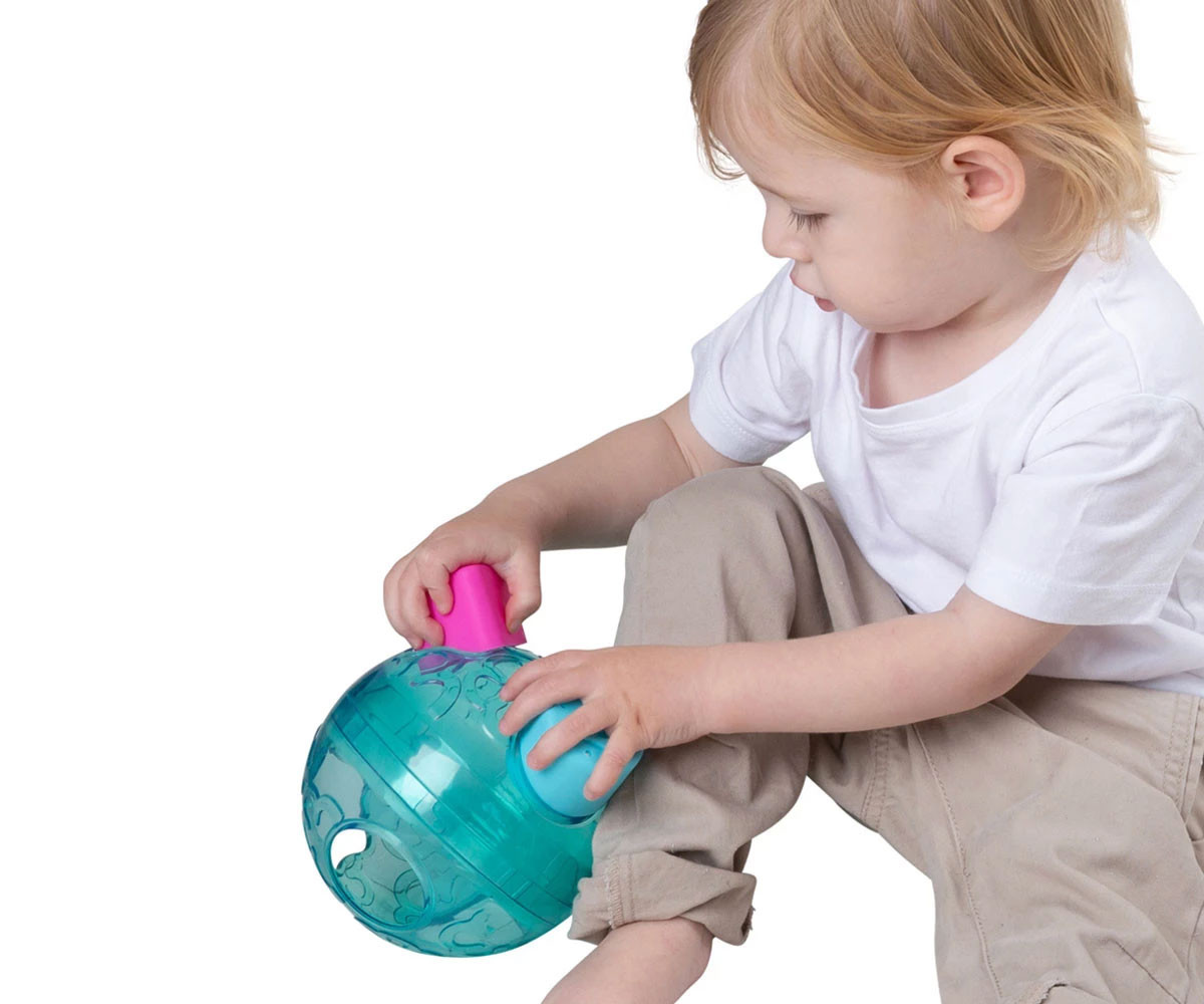 - Издава тракащи звуци при търкаляне, които стимулират слуха и интереса към движението;