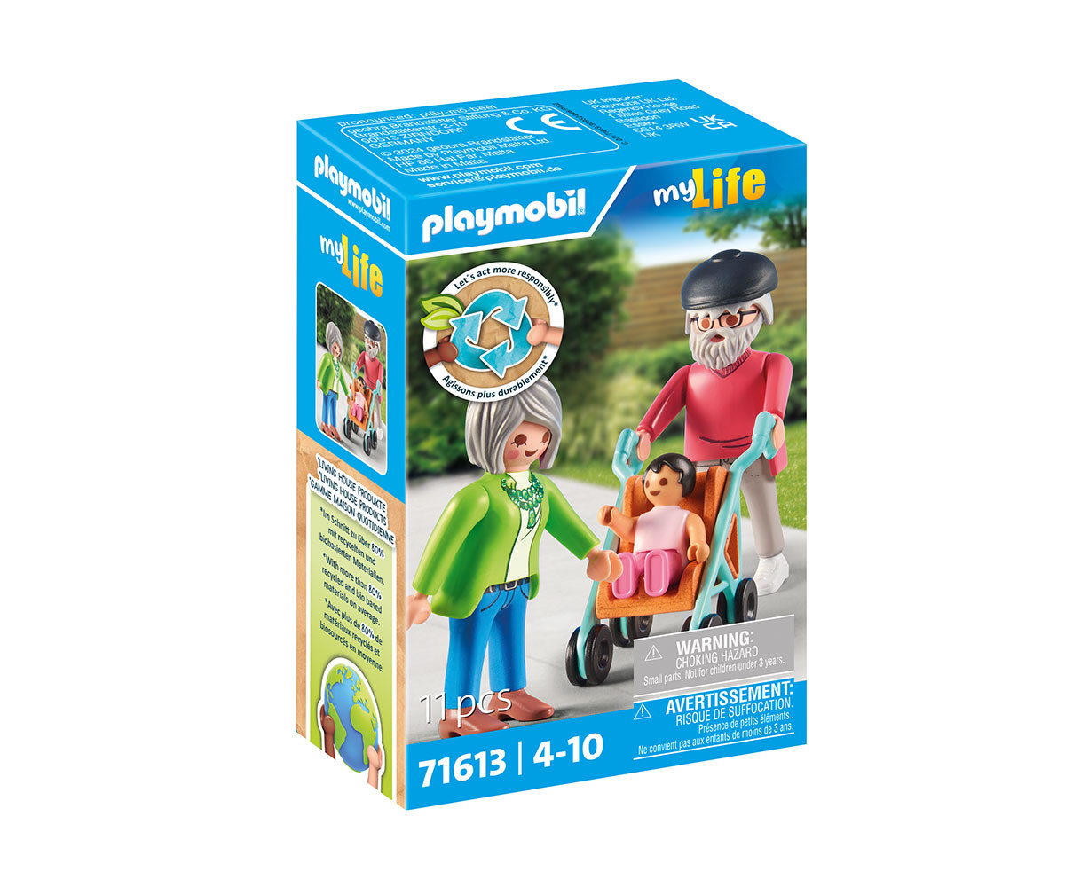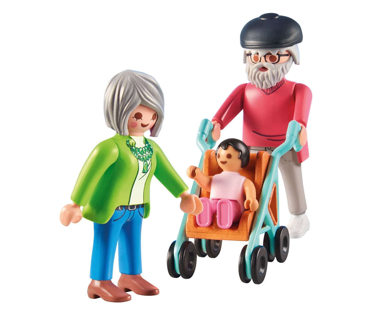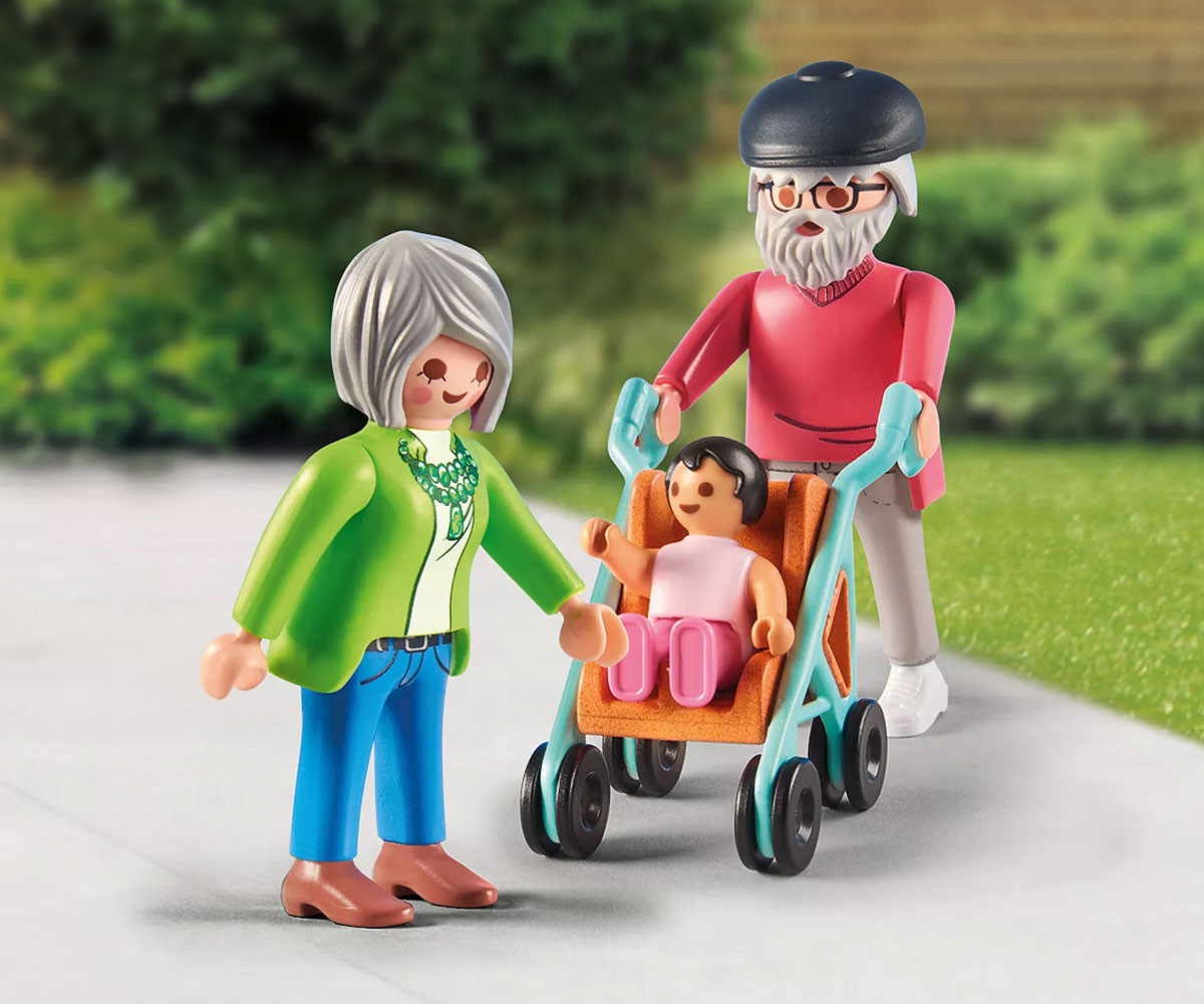 Бабите и дядовците са просто най-добрите! PLAYMOBIL комплект за игра Дядо и Баба с бебе. Дядо и баба с бебешка количка и внук.
