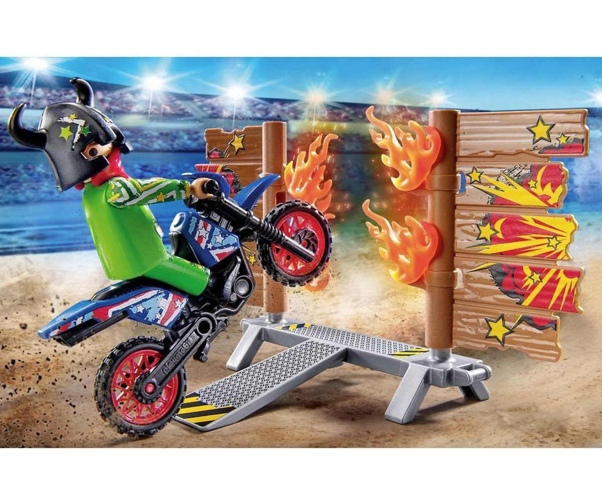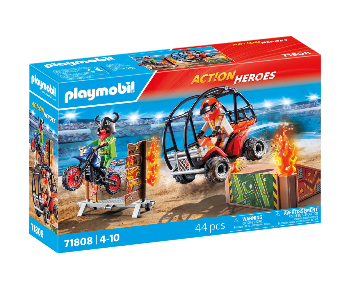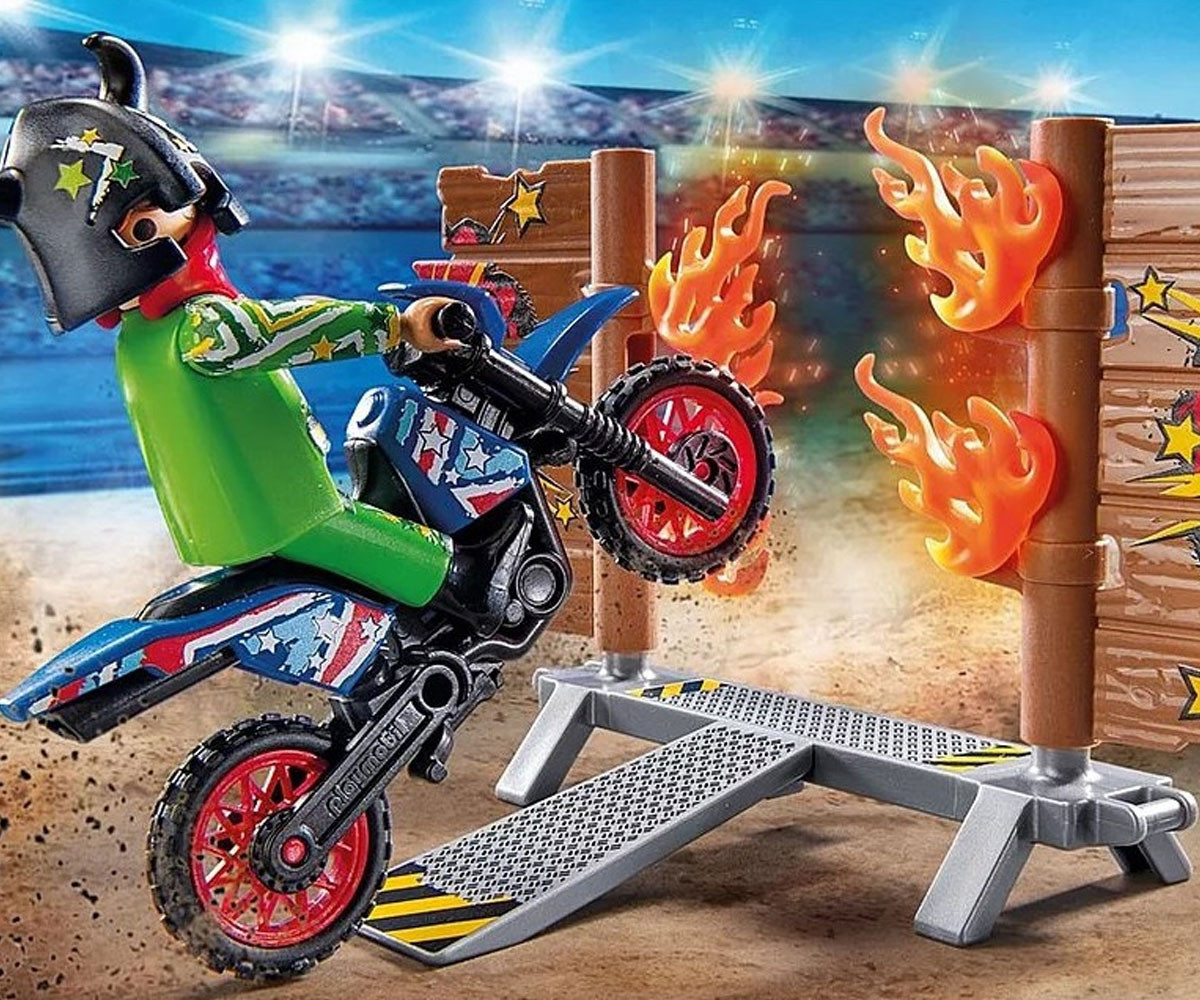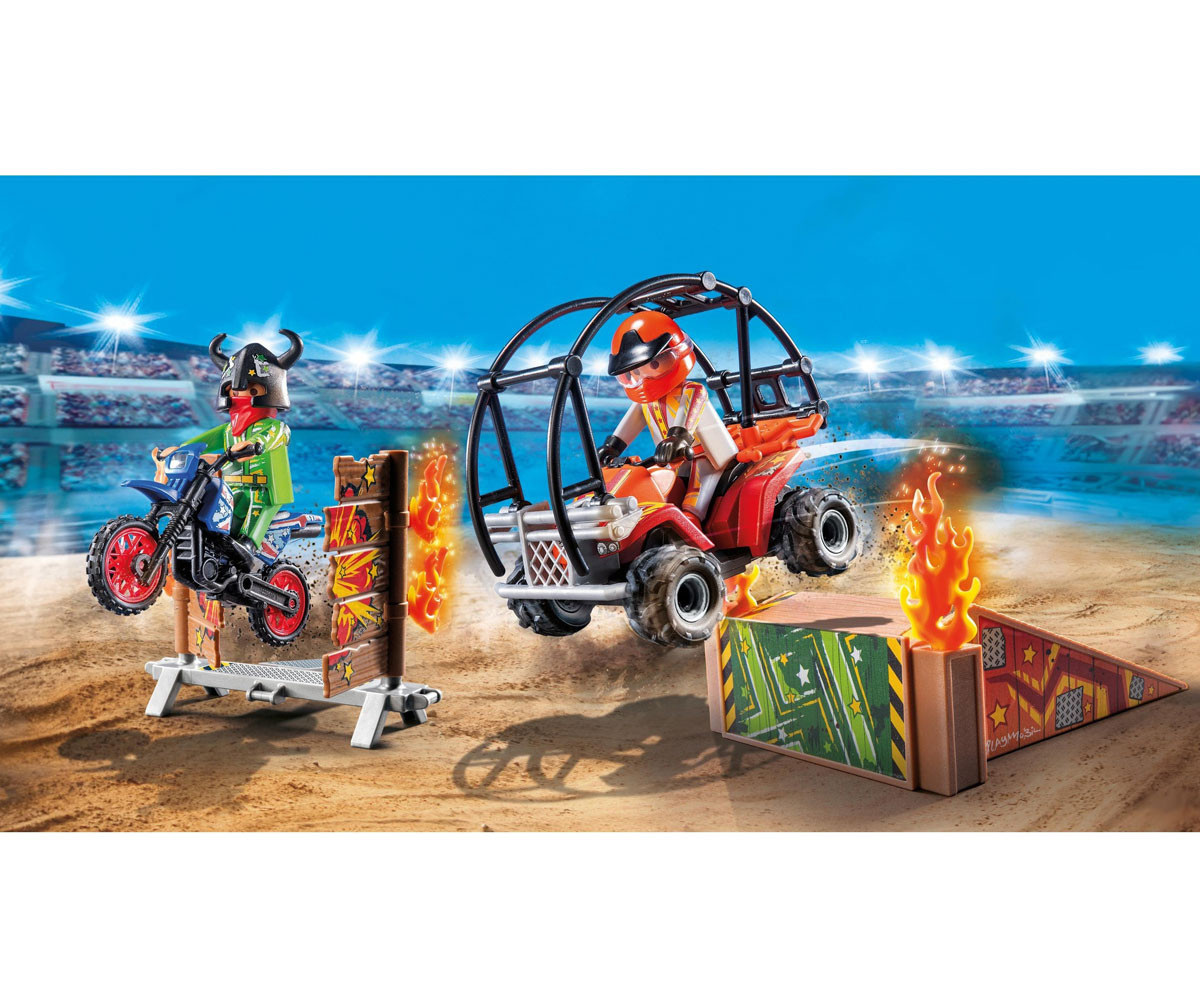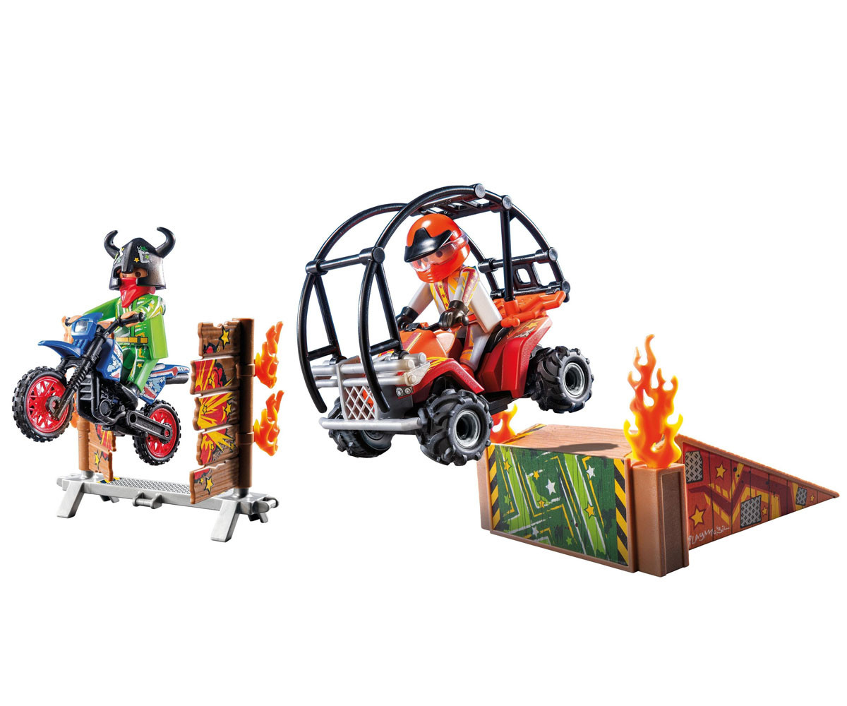 Много адреналин в шоуто за каскади! Голямата трамплинна рампа обещава много каскади. Кой каскадьор ще посмее да скочи през дървената стена и огъня? Включва каскадьорски мотор, ATV, двама каскадьори и безброй аксесоари. Пригответе се за запомнящи се усещания в PLAYMOBIL Каскадьорско шоу! Мотористът скача от наклона, за да се разбие през люлеещата се дървена стена или да премине през пламтящите огньове. Междувременно, ATV каскадьорът се подготвя за горяща каскада и с бързина преминава през високия наклон. Комплектът включва ATV за бързо действие, каскадьорски мотор за епични скокове и много аксесоари. Премахваемият наклон и стена улесняват смяната на каскадите, докато люлеещата се дървена стена добавя реалистичен ефект при удара. Перфектно за малки търсачи на усещания, PLAYMOBIL Каскадьорско шоу предлага активно забавление.