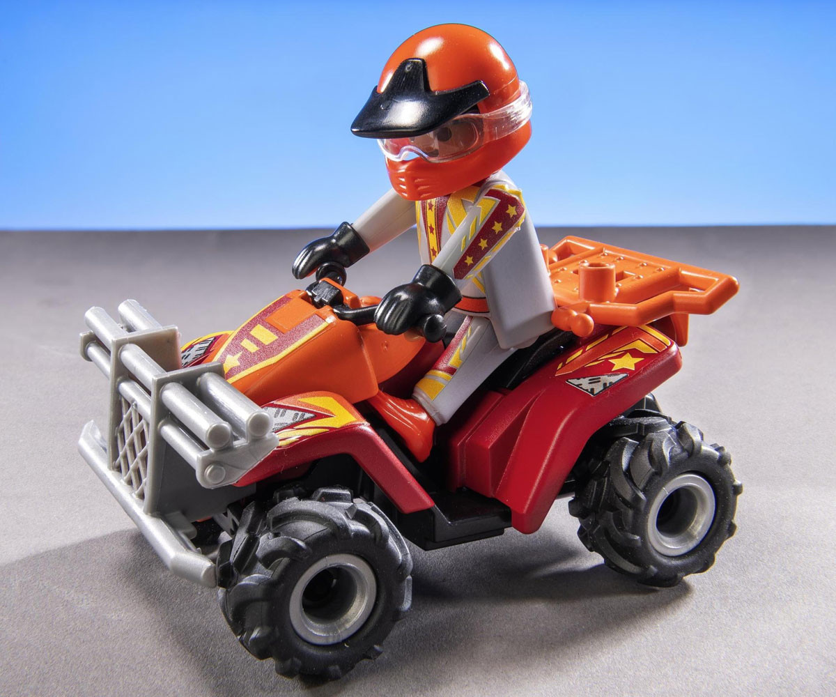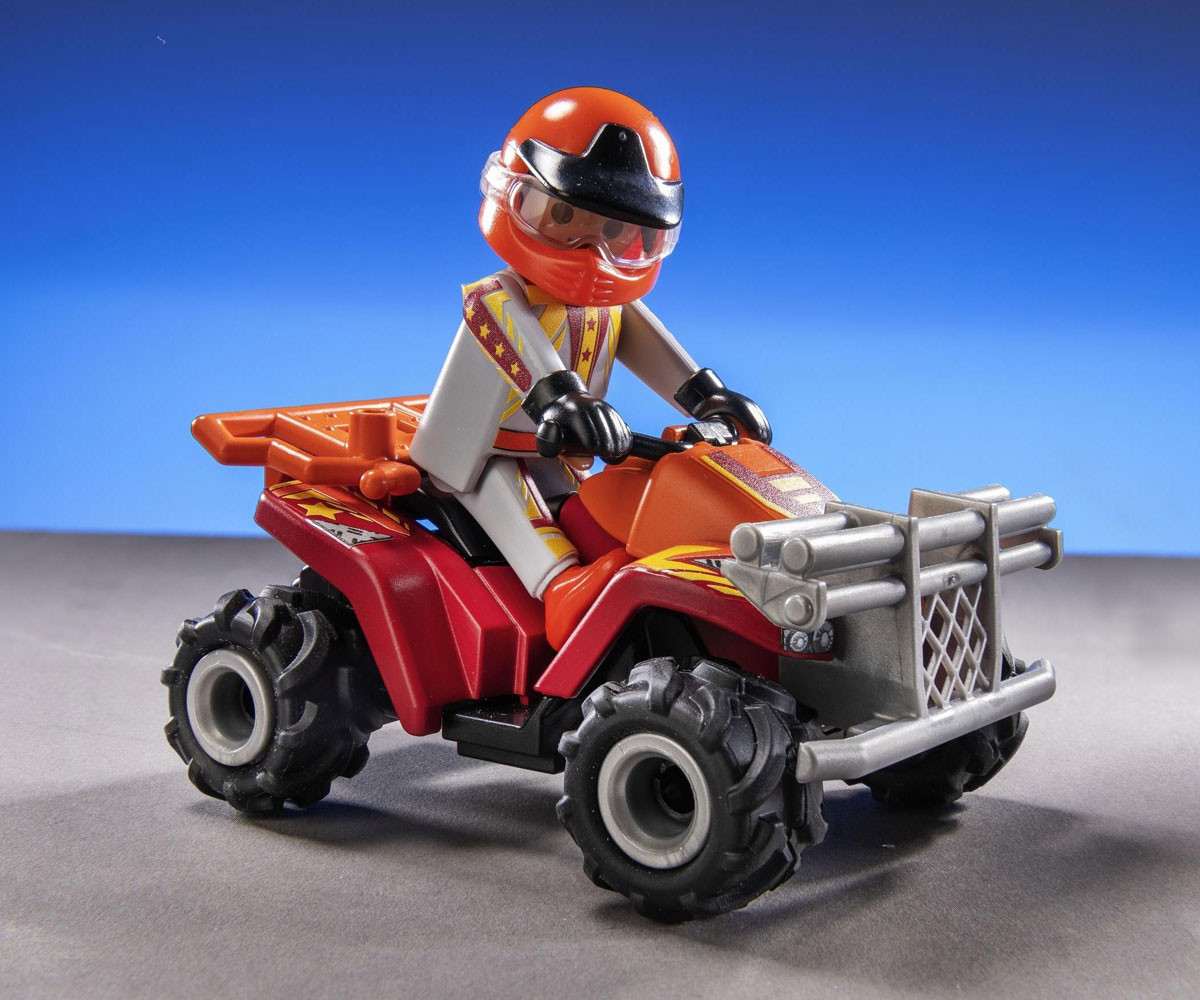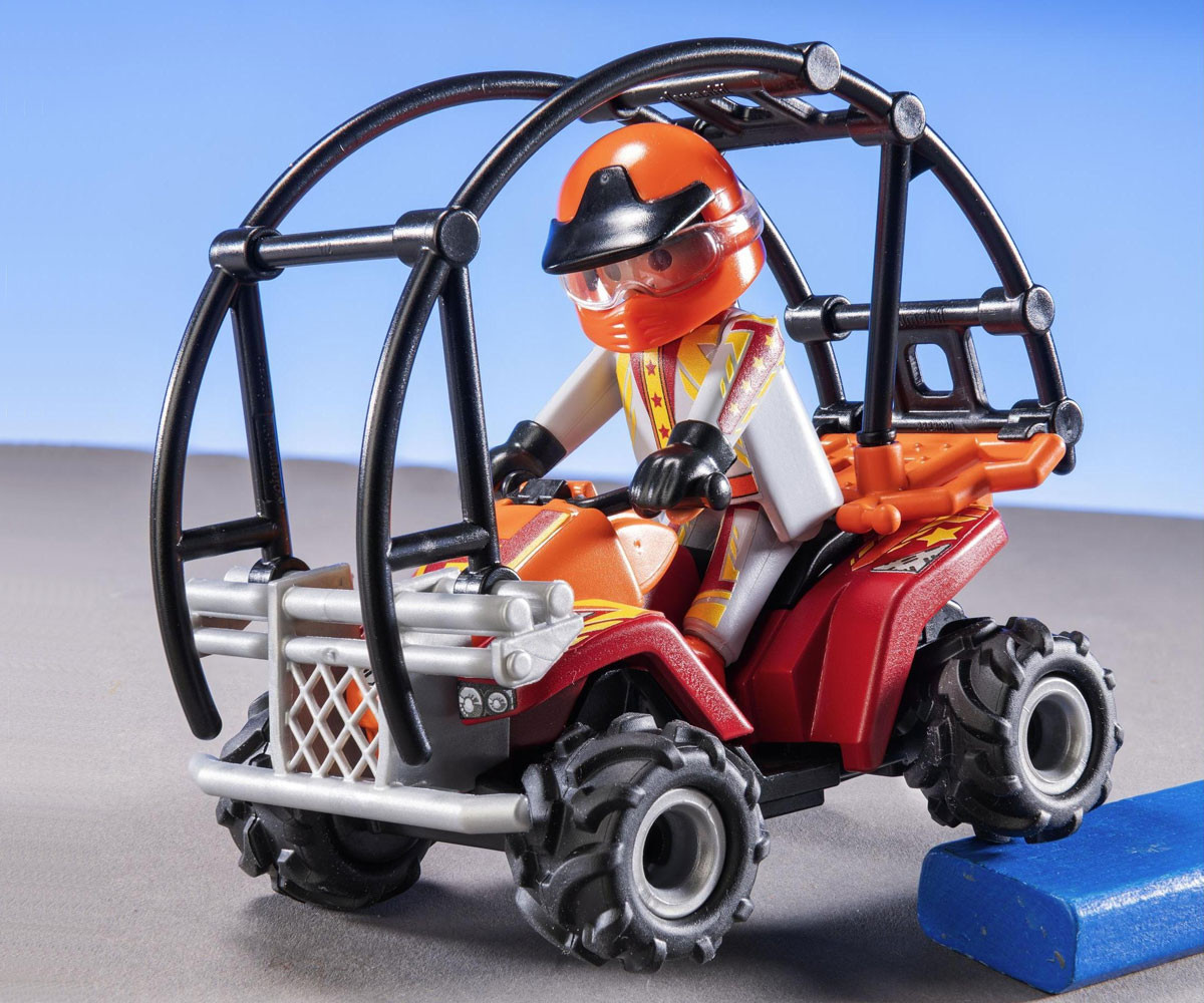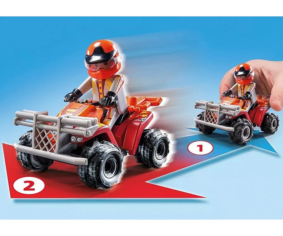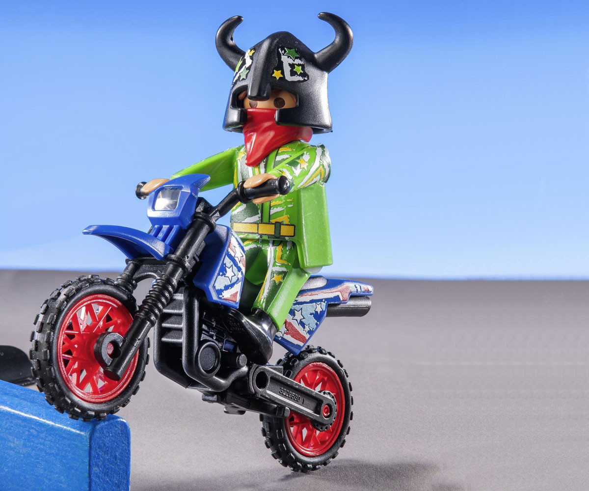 Много адреналин в шоуто за каскади! Голямата трамплинна рампа обещава много каскади. Кой каскадьор ще посмее да скочи през дървената стена и огъня? Включва каскадьорски мотор, ATV, двама каскадьори и безброй аксесоари. Пригответе се за запомнящи се усещания в PLAYMOBIL Каскадьорско шоу! Мотористът скача от наклона, за да се разбие през люлеещата се дървена стена или да премине през пламтящите огньове. Междувременно, ATV каскадьорът се подготвя за горяща каскада и с бързина преминава през високия наклон. Комплектът включва ATV за бързо действие, каскадьорски мотор за епични скокове и много аксесоари. Премахваемият наклон и стена улесняват смяната на каскадите, докато люлеещата се дървена стена добавя реалистичен ефект при удара. Перфектно за малки търсачи на усещания, PLAYMOBIL Каскадьорско шоу предлага активно забавление.