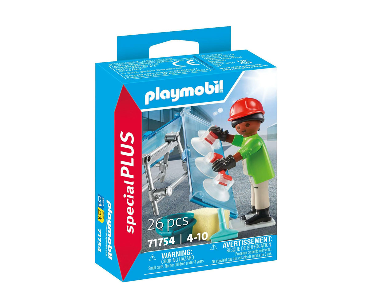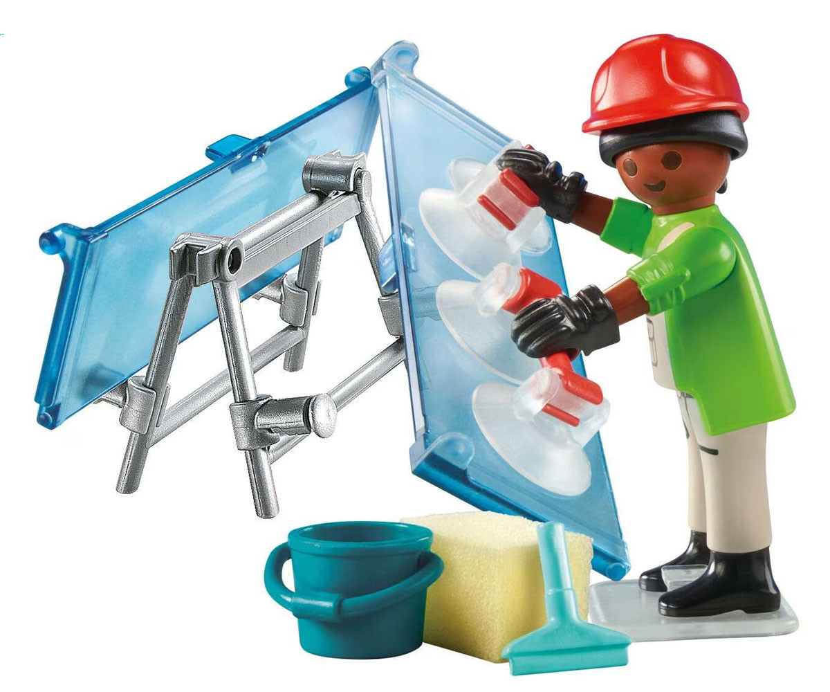 PLAYMOBIL Special Plus Стъклар включва две стъклени плочи, вакуумни капаци и аксесоари за перфектен блясък на прозореца. Оживете сцените си с комплекта PLAYMOBIL Стъклар! Стъкларят използва вакуумните капаци, за да държи стъклата сигурно за реалистична игра. Независимо дали инсталирате ново стъкло, или му придавате кристален блясък с предоставената кофа и гъба, стъкларят осигурява прецизност и блясък на всяко прозорче. Стъклените панели могат да бъдат изложени на поставката, докато основата осигурява стабилност на стъкларя по време на работа. За още повече забавление ръкавиците и шапката могат да бъдат премахнати. Този комплект е идеален за творчески умове и гарантира часове фантастична игра!
