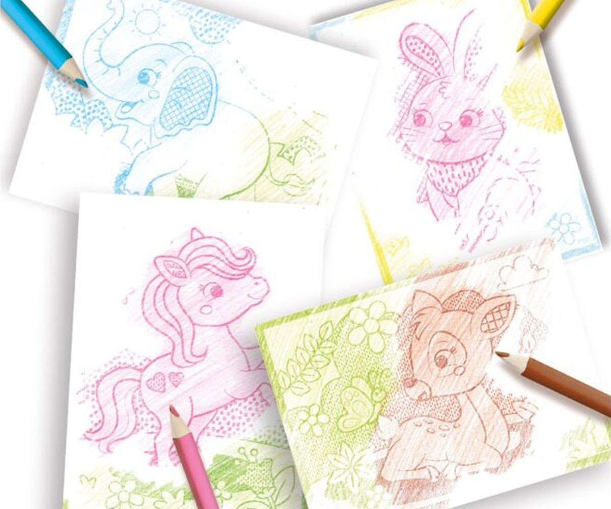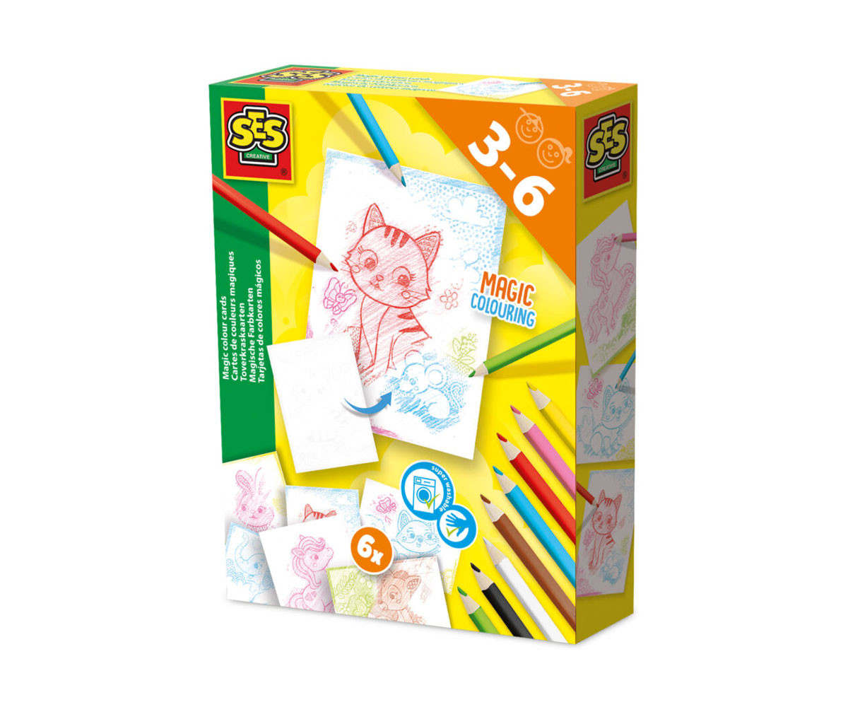 Открий Магическите цветни карти за вълшебно творческо изживяване! Изтрий и разкрий 6 весели дизайна с помощта на 8 ярки цветни молива и виж как магията оживява! Лесно и забавно занимание, което винаги води до красив резултат.