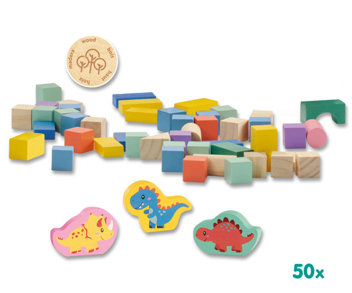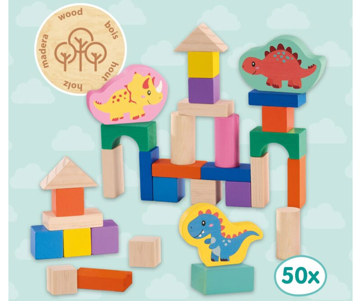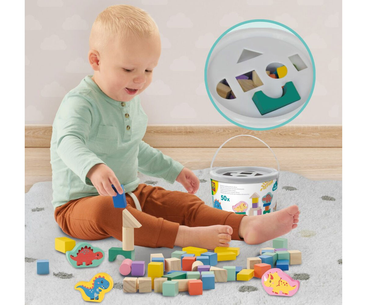 Позволете на вашето дете да строи и мечтае с комплекта дървени строителни блокчета Dinos – кофа с 50 части! Тази кофа съдържа 50 дървени блокчета в модерни цветове, включително 3 фигурки на динозаври с принт. С този комплект децата могат да строят кули, къщи и други конструкции, като развиват своето въображение, пространствено мислене и фини двигателни умения. След игра блокчетата се съхраняват лесно в кофата. Капакът на кофата е сортер, през който детето трябва да постави блокчетата в съответните отвори – допълнително забавление и учене!