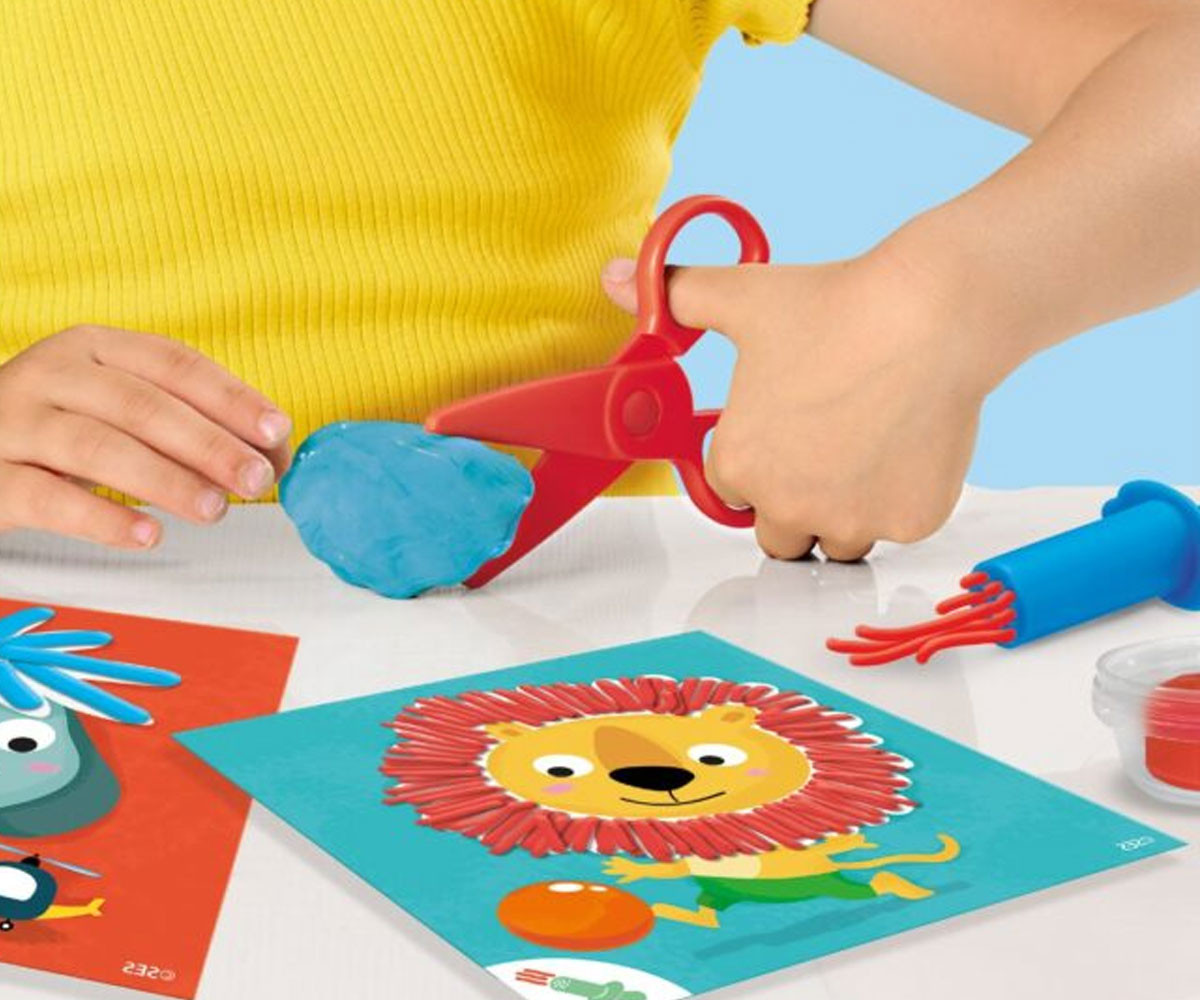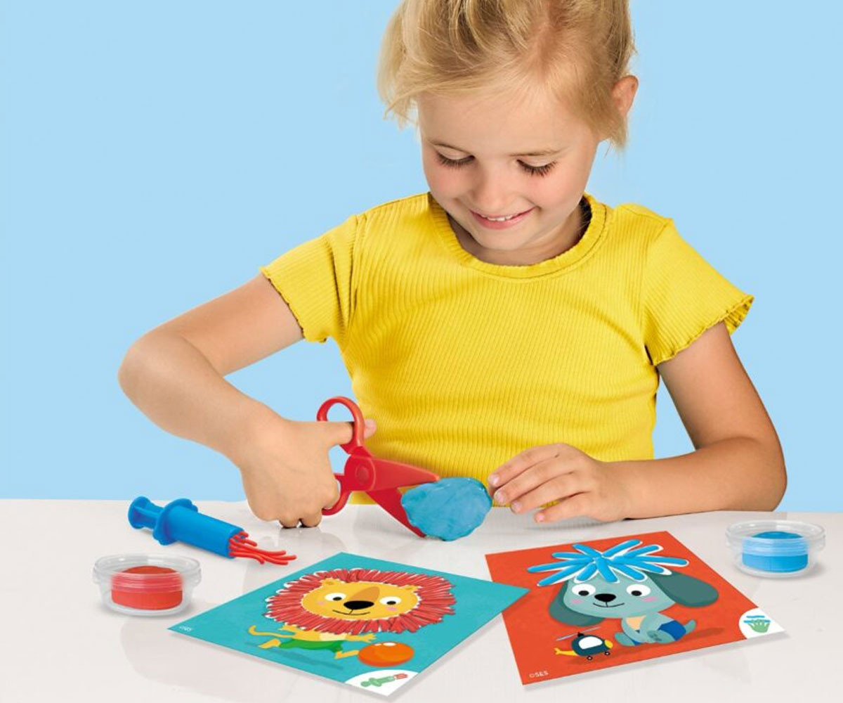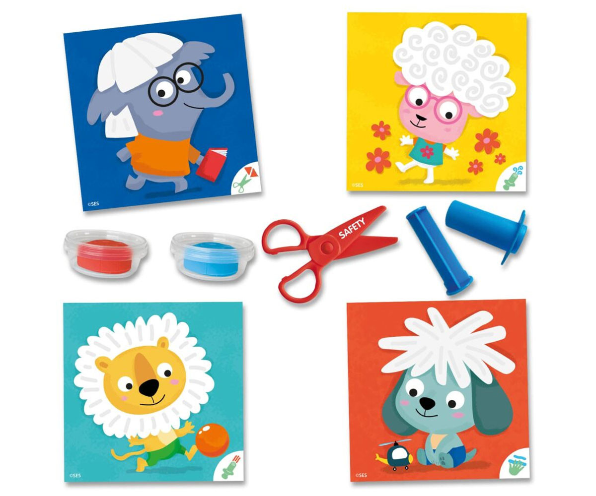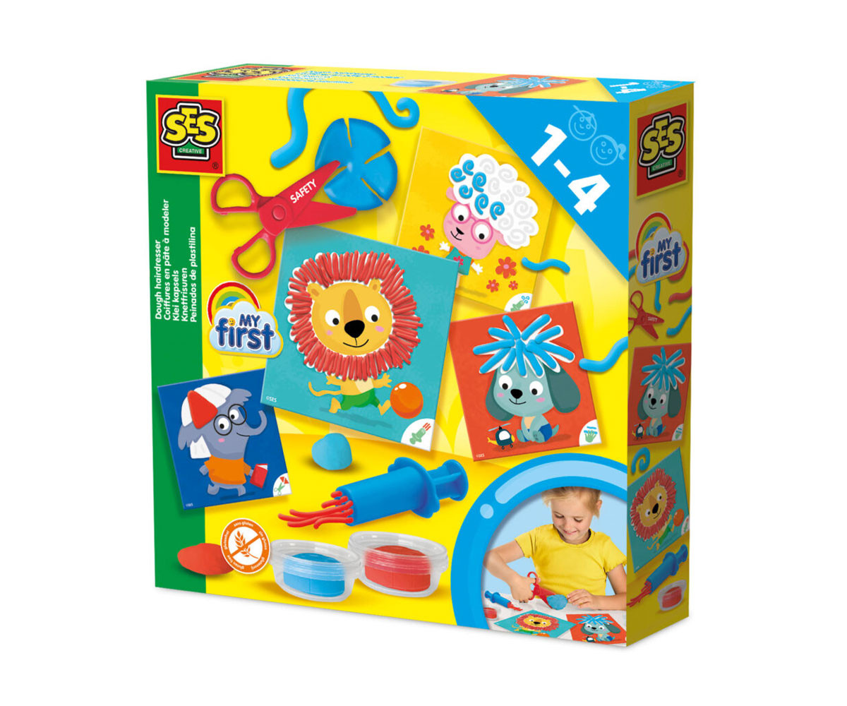 Потопи се в света на творчеството с комплекта „My First – Фризьорско студио с пластилин“! Създавай цветни прически от пластилин и ги подстригвай с помощта на безопасната ножичка, която реже хартия и пластилин, но е напълно безопасна за коса и дрехи. Използвай екструдерa за пластилин, за да оформяш забавни прически върху многократните карти за игра с животински лица. Комплектът включва светлосин и червен пластилин (по 40 грама), безопасна ножичка, екструдер и 4 многократни карти за безкрайно забавление и учене чрез игра.