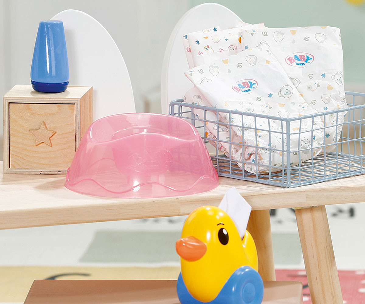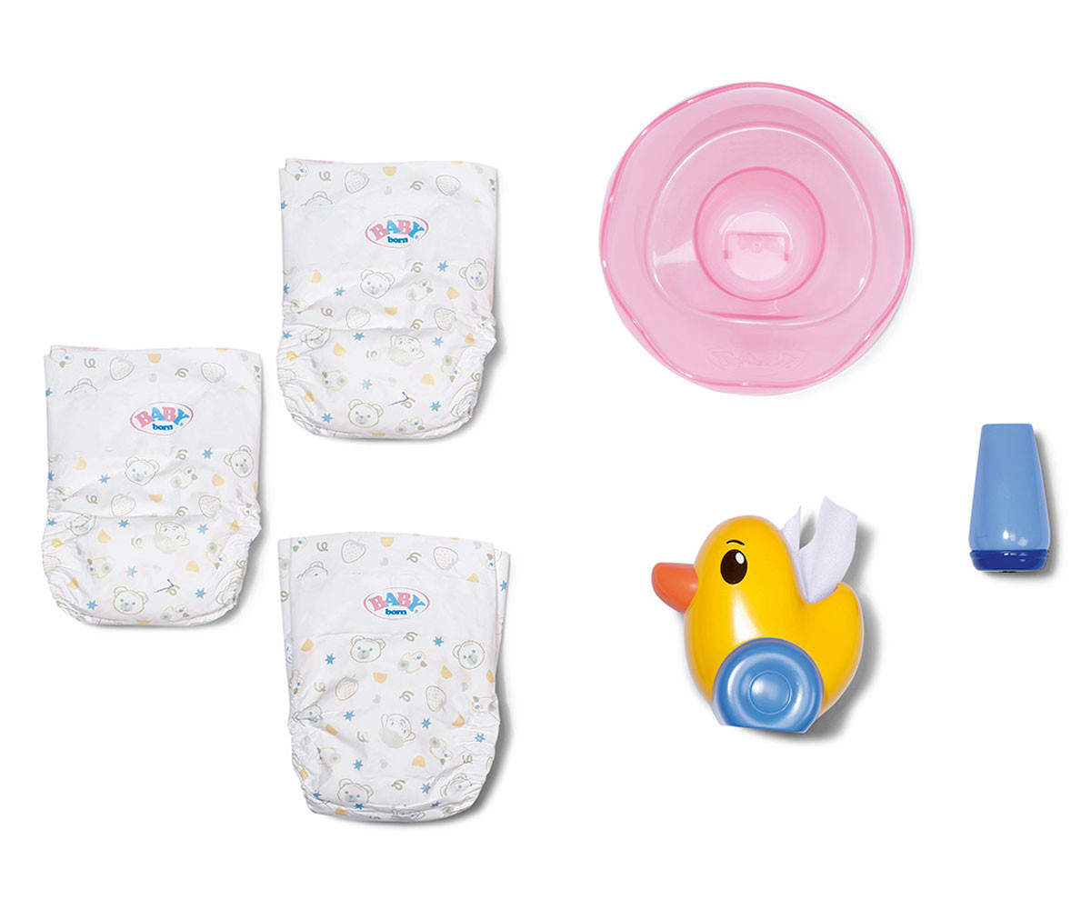 Да започнем с гърнето! С този практичен и забавен комплект, малките „родители“ могат да направят ежедневието на своите кукли още по-реалистично. Комплектът съдържа розово гърне с бутон за „пускане“, три пелени, бутилка със сапунче и забавен диспенсър за кърпички във формата на патенцето Берта. Той е създаден, за да насърчава грижовна игра, като едновременно с това подпомага малчуганите в процеса на приучаване към гърне. Благодарение на реалистичния дизайн и детайлите, играта става по-вълнуваща и увлекателна.