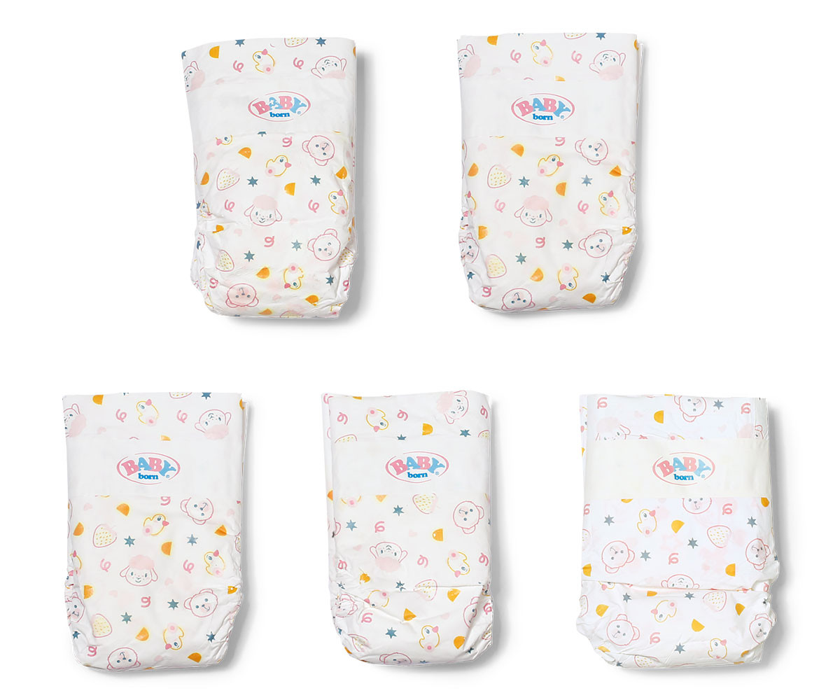 BABY Born® Памперси – комплект от 5 броя за кукли 43 см. Сухата кукла е щастлива кукла! С този комплект от 5 сладки пелени, всяко дете ще бъде напълно подготвено да се грижи за своята BABY Born® кукла.