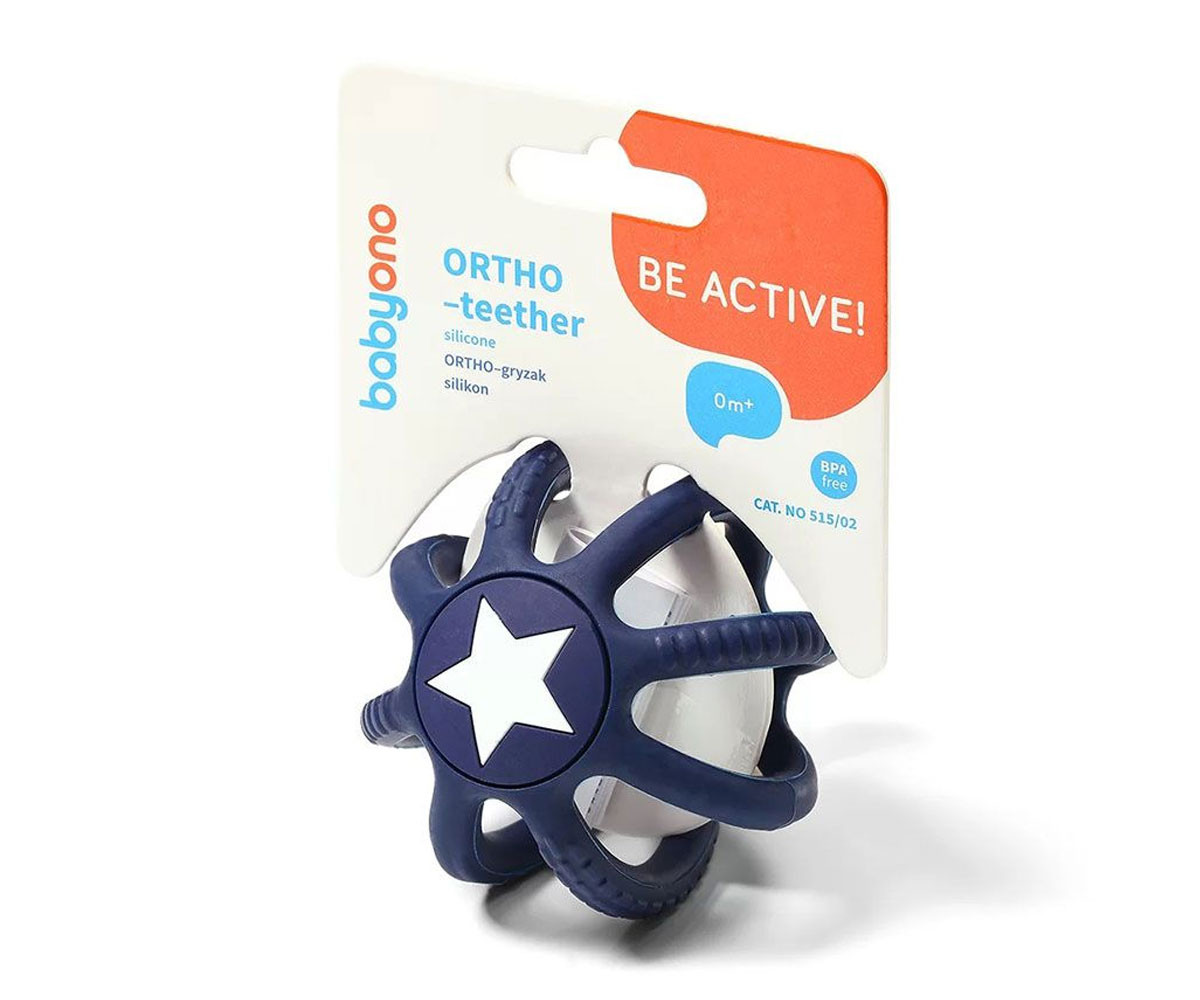 Гризалките ORTHO са специално проектирани да отговорят на нуждите на най-малките. Благодарение на професионални консултации с детски зъболекари от медицинския университет Karol Marcinkowski в Познан, специлистите от Babyono са създали специална колекция гризалки, елиминиращи неудобствата по време на никненето на първите зъбки. Изработен от ултра мек силикон с оригинална структура и форма, проектирана специално за малките бебешки ръчички.