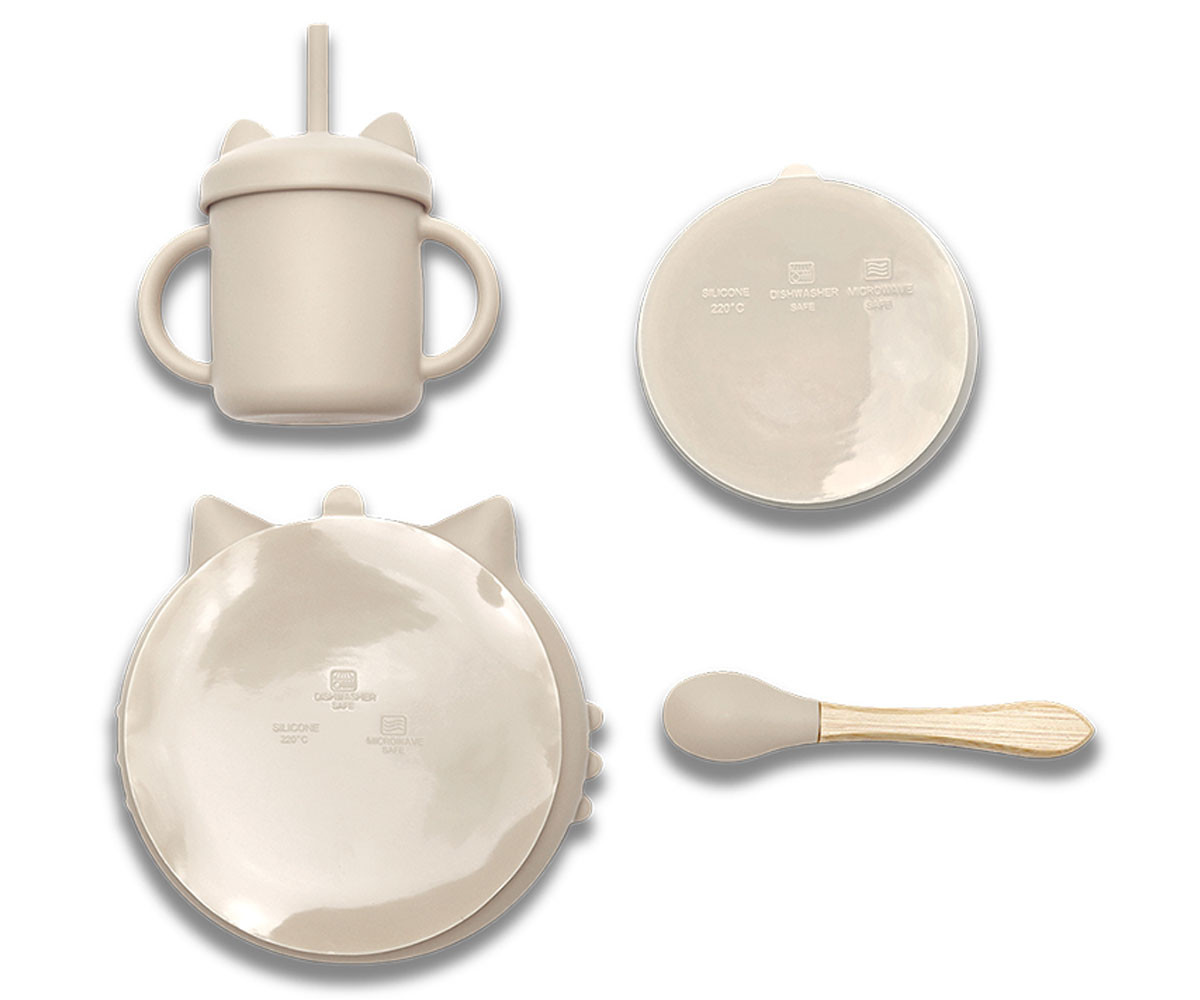 Комплектът е изработен от безопасен и подходящ за храна материал, който е нежен към венците и към растящите детски зъби. Чинията и купата са с основа, която се фиксира с вендузи и се почистват лесно. Лъжичкaта е идеална за новият етап в захранването на Вашето бебе. Чашата се предлага с подвижен капак и мека сламка. Комплектът включва: силиконова вакуум купа, силиконова чаша с дръжки и сламка, силиконова чиния и силиконовa лъжичкa с бамбук.