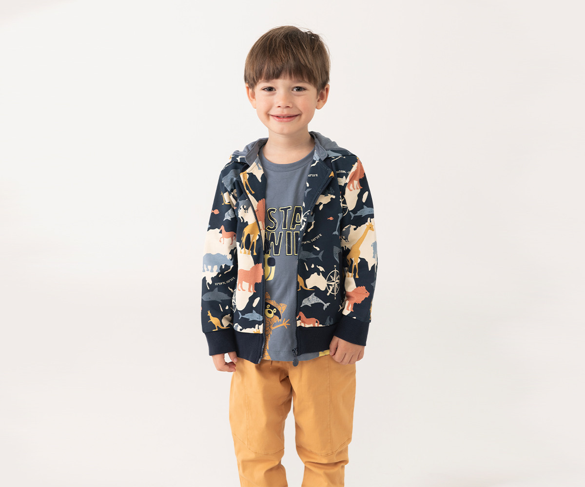 Суитшърт за момче в тъмносин цвят с животински десен – перфекен за есенно-зимния сезон. Изработен от мек и топъл материал, той осигурява комфорт и защита в студените дни. Забавният десен в различни цветове върху син фон придава игрив и модерен акцент. Идеален за съчетаване с панталони или дънки, като съчетава стил и практичност в едно.