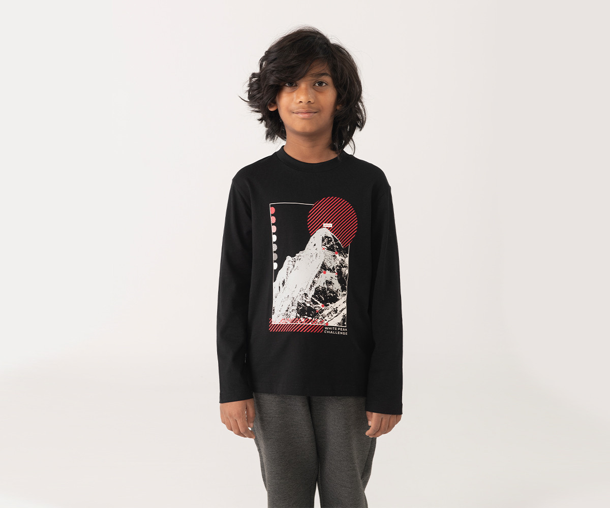 Детска памучна тениска в черен цвят – основен елемент за есенно-зимния сезон. Изработена от мек и удобен плат, тя осигурява комфорт през целия ден. Декорирана е с щампа на планина, която придава приключенски характер – идеална за малки откриватели. Черният цвят я прави универсална и лесна за комбиниране с дънки, спортни панталони или якета. Перфектен избор за ежедневието, съчетаващ стил и удобство.