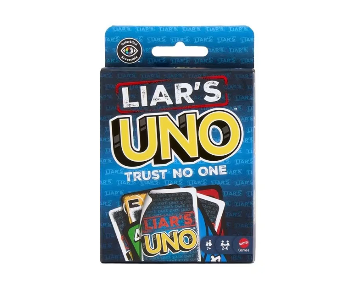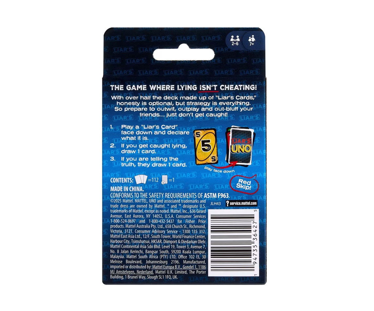 Феновете на UNO ще се влюбят в този забавен обрат на класическата игра, в който лъжите летят, а блъфът води до победа! В Liar’s UNO се играе специална „карта на лъжеца“, която се поставя с лицето надолу, а играчът обявява каква е. Истина ли казва или блъфира? Ако бъде предизвикан и се окаже, че лъже - той тегли карта. Но ако казва истината, тогава обвинителят трябва да тегли карта. Затова запазете лицето си невъзмутимо, прикрийте издайническите знаци и, когато ви остане само една карта, не забравяйте да извикате „UNO!“ Идеален подарък за любителите на игри с карти на възраст 7+ години. Цветовете и декорациите може да варират.