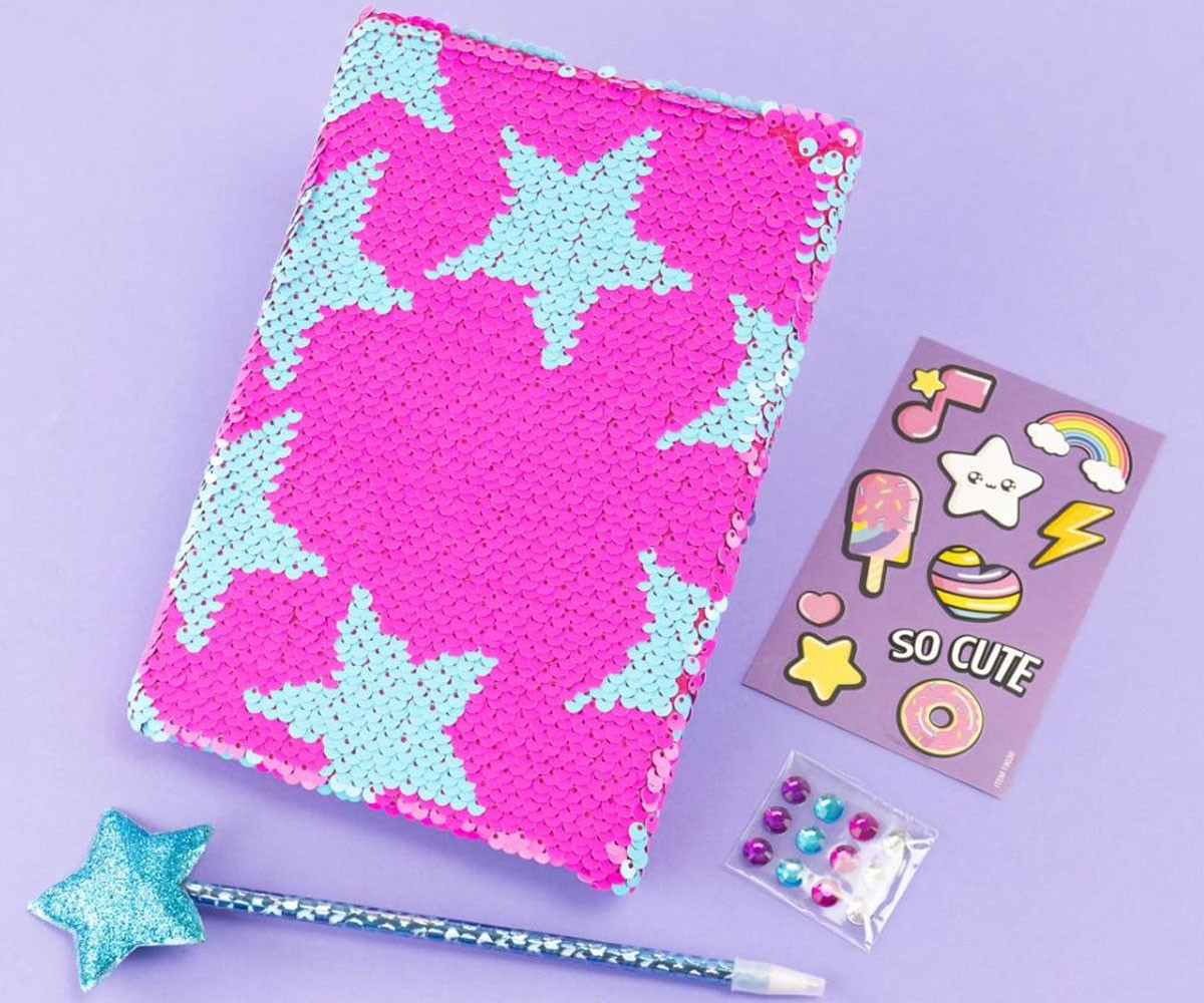 - 1 дневник с блестяща корица от обръщащи се пайети;