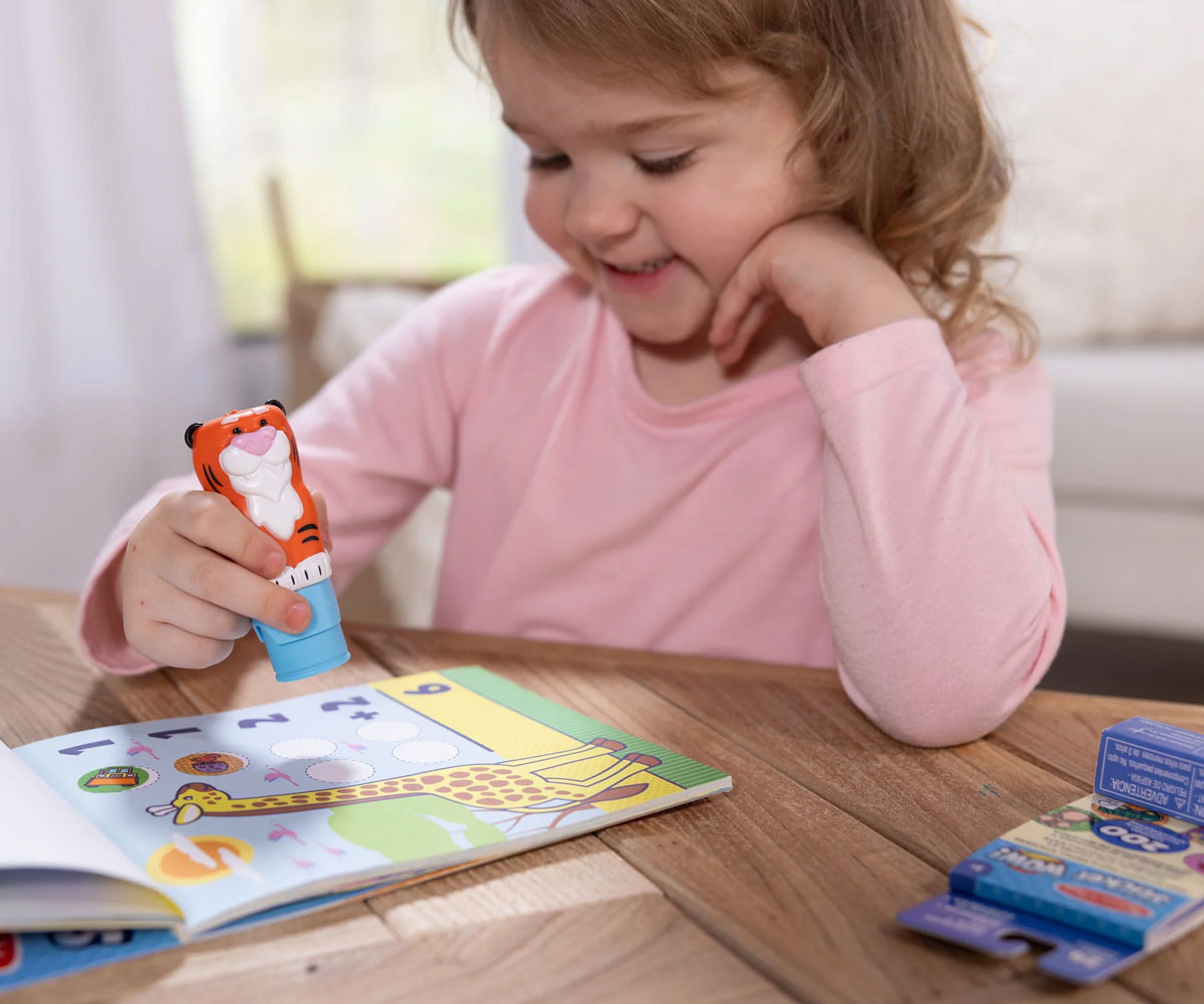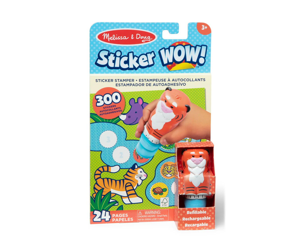Забавните занимания включват числа, броене, съчетаване, търси и открий и още много! Стикерите не са за многократна употреба, но могат да се премахват лесно при нужда. Компактният формат с вградено място за съхранение на печата и лесното отстраняване на стикерите правят Sticker WOW!™ идеален за пътуване, занаяти, сензорна игра и като колекционерска играчка – всичко в едно. Перфектен подарък за момичета и момчета на възраст от 3 до 7 години, за забавна и занимателна игра с ръчички далеч от екраните. Melissa & Doug Sticker WOW!™ е нов, вълнуващ начин за игра със стикери! Позволи на очарователния герой Pumpkin the Tiger да „щампове“ през 24 страници, пълни с игри за броене, съчетаване и търсене. Печатът за стикери е презареждаем и идва предварително зареден с 300 различни стикера – с 100 уникални дизайна във всяка купчина, като всеки стикер е изненада. Стикерите не са за многократна употреба, но могат да се премахват лесно. Използвай ги, за да попълваш книжките или за креативни арт проекти – като разделители за книги, плакати, картички и други. Благодарение на лесното отстраняване на стикерите и практичния формат за пътуване с вградено място за съхранение, Sticker WOW!™ е чудесна безбъркотийна активност в движение. Sticker WOW!™ развива фината моторика, насърчава творческата игра и предлага удовлетворяващо, сензорно забавление!