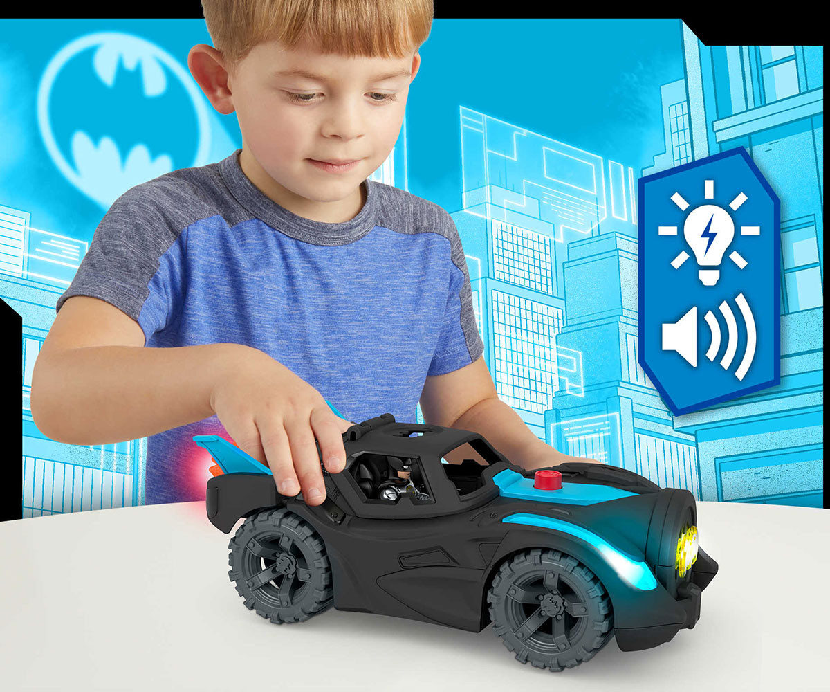 Младите борци с престъпността могат да пренесат своите приключения с Батман на ново ниво с този Imaginext DC Super Friends Lights & Sounds Batmobile от Fisher-Price. Този напълно оборудван push-along Батмобил има страхотни светлини и звуци, които се активират, когато децата движат колата. С Батман на шофьорското място, децата могат също да натиснат бутона, за да видят как осветлението на фигурата и на колата се включва! Поставете втори герой от Imaginext DC Super Friends на пътническото място за още супергеройски приключения. (Допълнителни фигурки се продават отделно и са налични според наличността.) Цветовете и декорациите може да се различават.