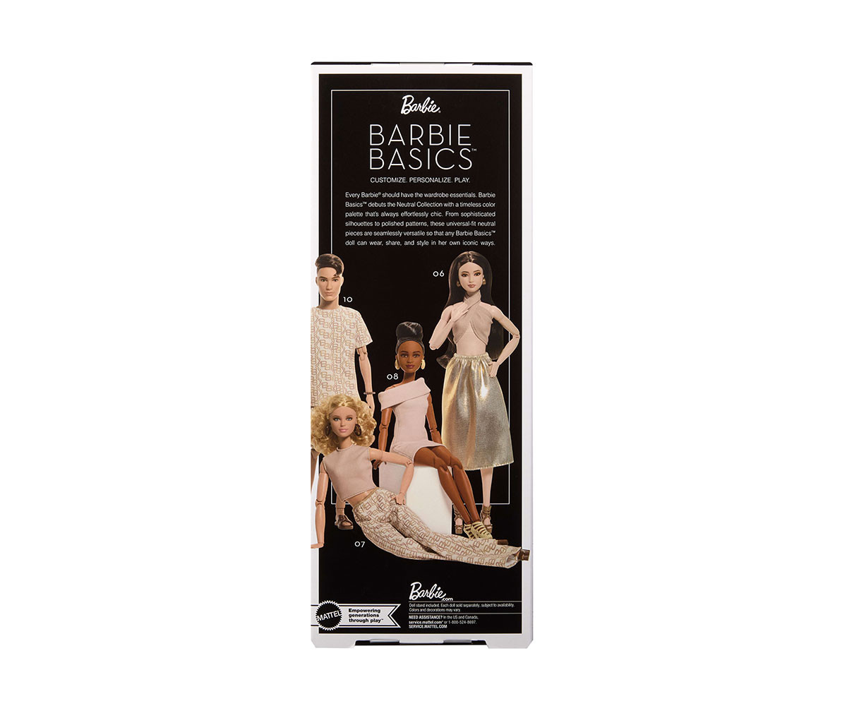 Емблематичната колекционерска линия Barbie Basics от Barbie Signature представя Neutral Collection - изискана селекция в неутрални тонове, които са винаги стилни и модерни. Със своите елегантни силуети и прецизни детайли, моделите от Barbie Basics правят смело модно изявление чрез изчистени и универсални визии. Благодарение на еластичните материи с универсален размер, колекционерите могат да комбинират и стилизират различни емблематични тоалети върху всички кукли от серията. Включени са стойка за кукла и сертификат за автентичност. Куклата не може да стои изправена самостоятелно. Цветовете и декорациите може да варират.