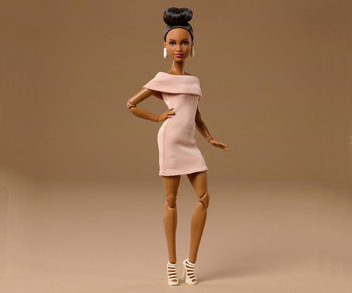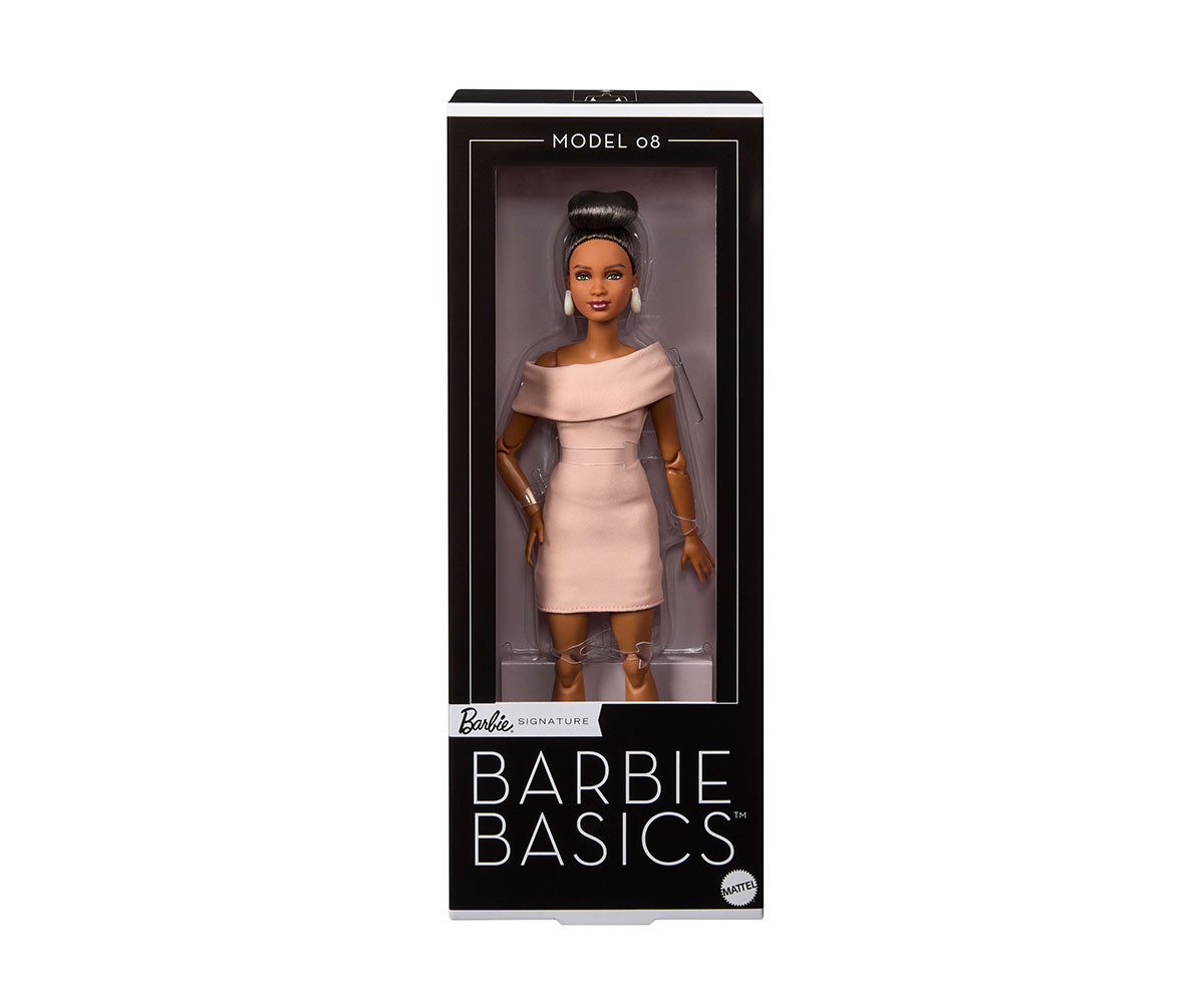 - Barbie Basics Model 08 въплъщава модерния минимализъм в елегантна бежова рокля с драматично деколте и кремави сандали с тънки каишки;