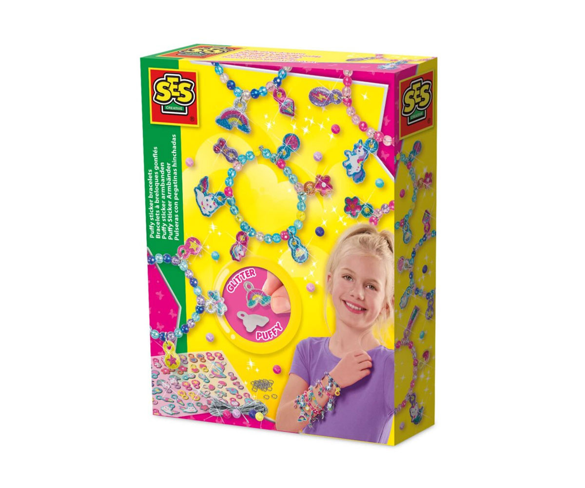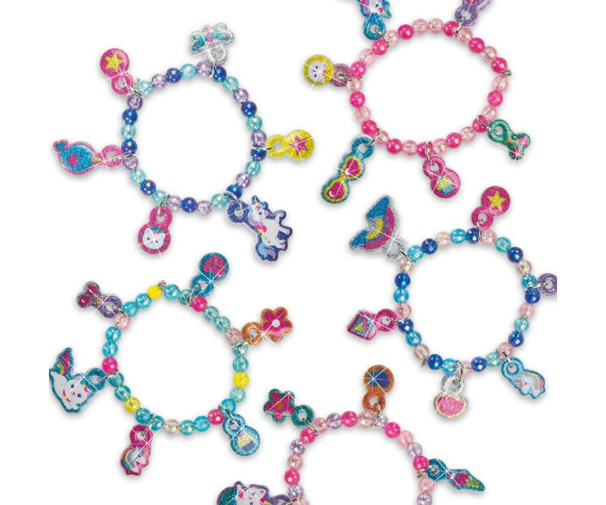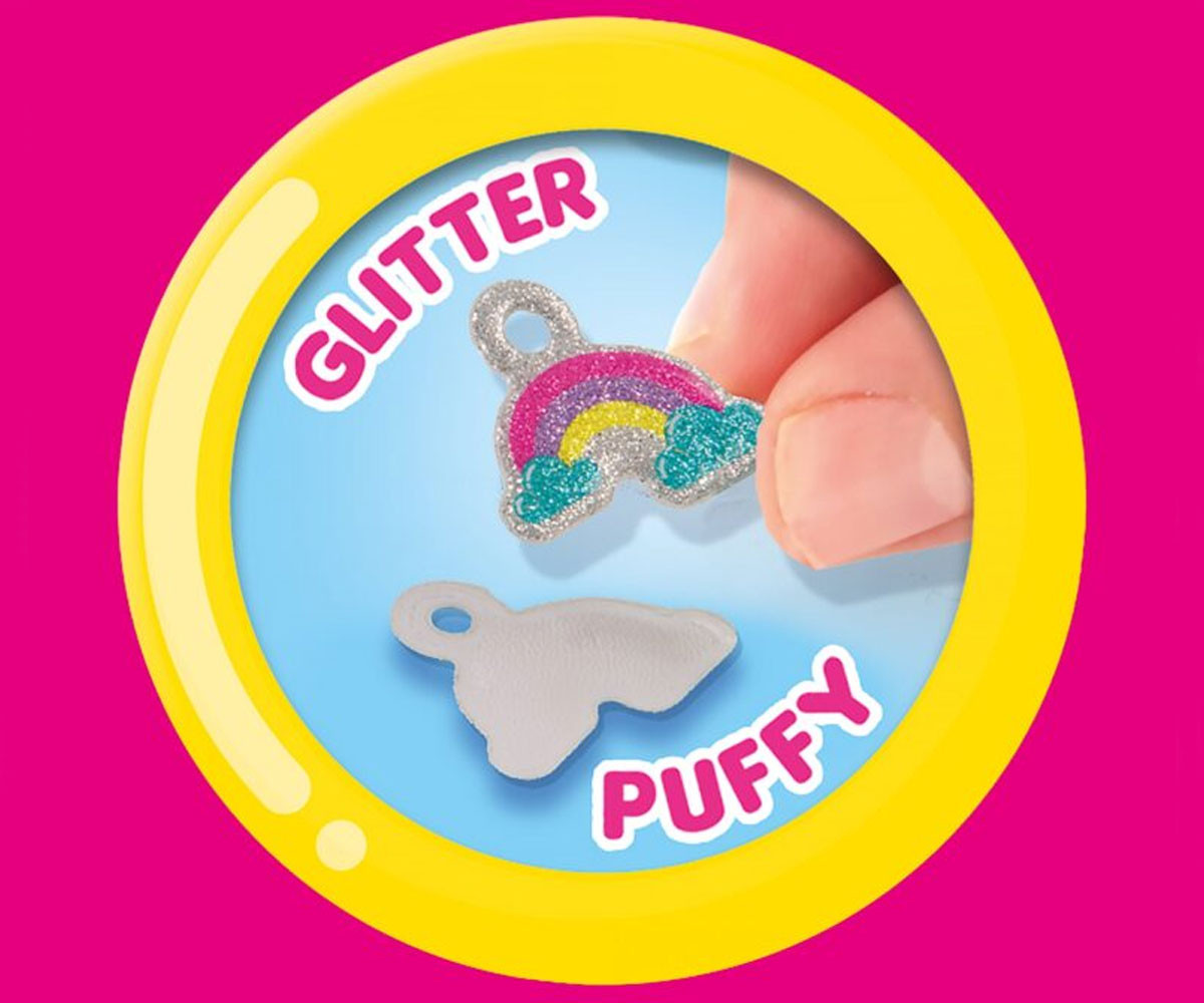 Създай модерни гривни с комплекта Puffy Sticker Bracelets! Изработи свои собствени висулки, като съединиш по два пухкави брокатени стикера и ги прикрепиш към гривните с помощта на метални халки. Декорирай 5 гривни с пъстри мъниста и ръчно направени висулки, за да създадеш уникални и стилни аксесоари.