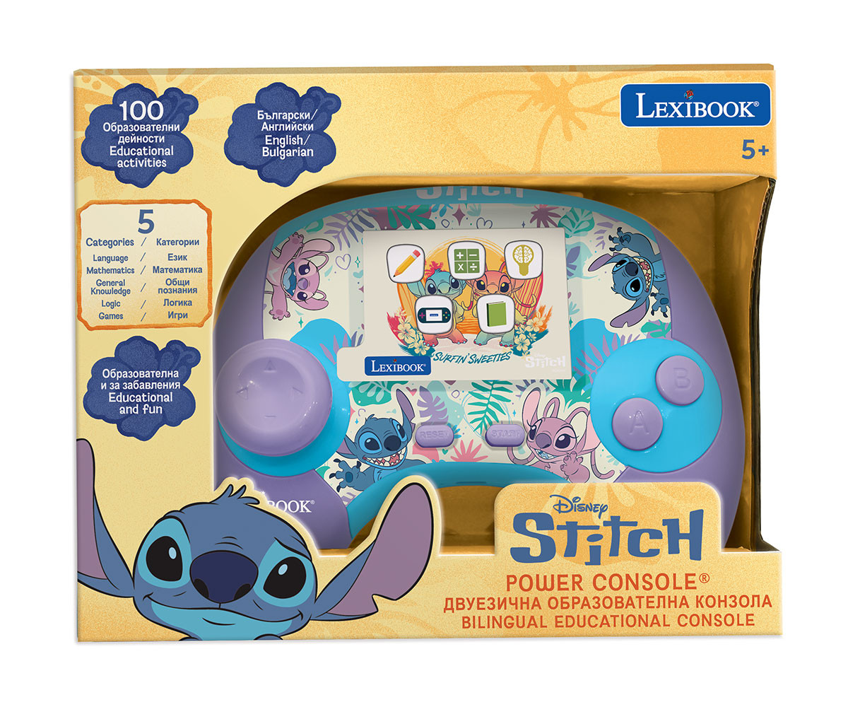 Образователно съдържание за учене, преговор и тестване на знанията – всичко това в една супер забавна конзола със Стич! Налични са 5 категории активности на български и английски език: език, математика, обща култура, логика и игри!