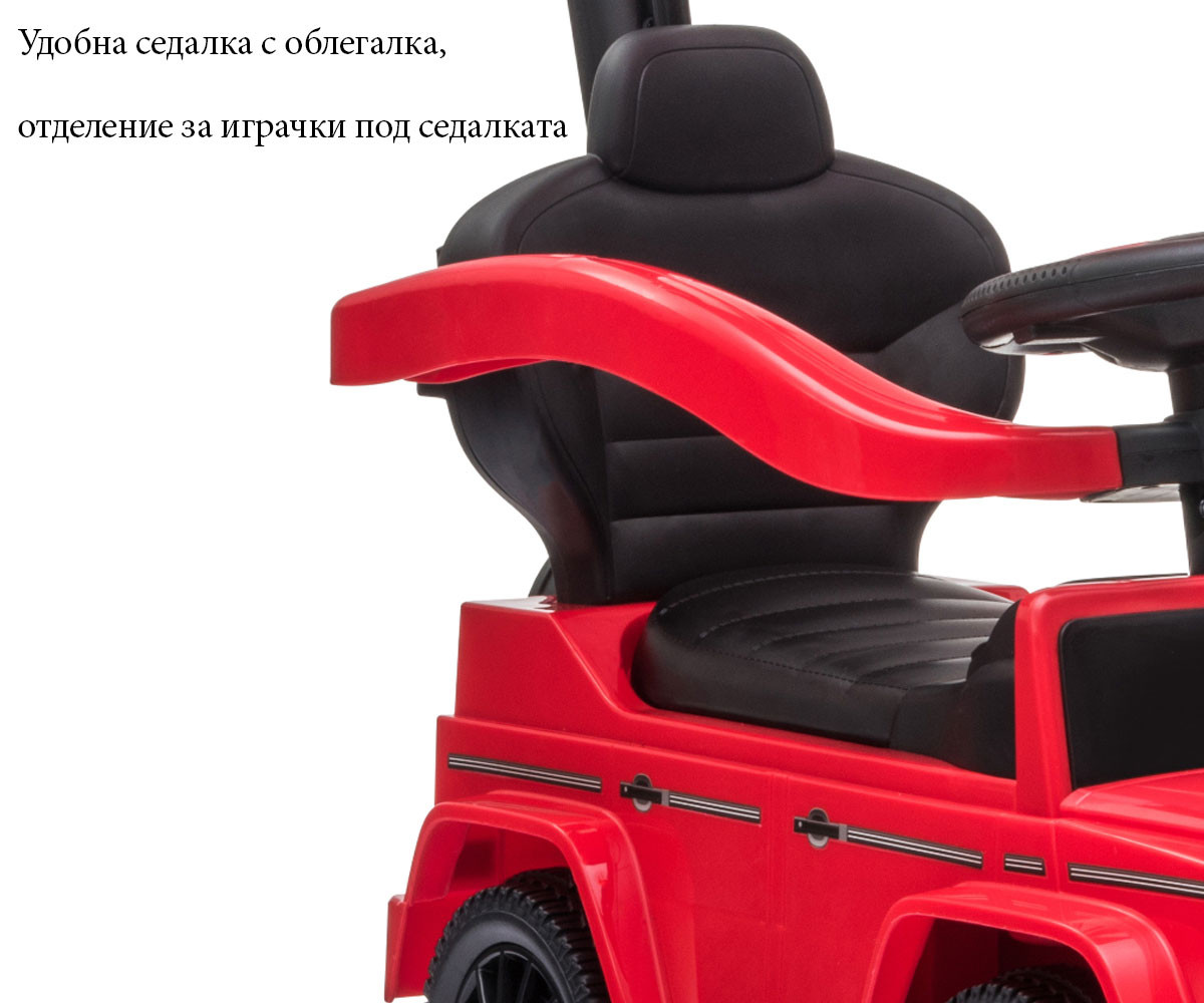 - удобна седалка с облегалка, отделение за играчки под седалката;