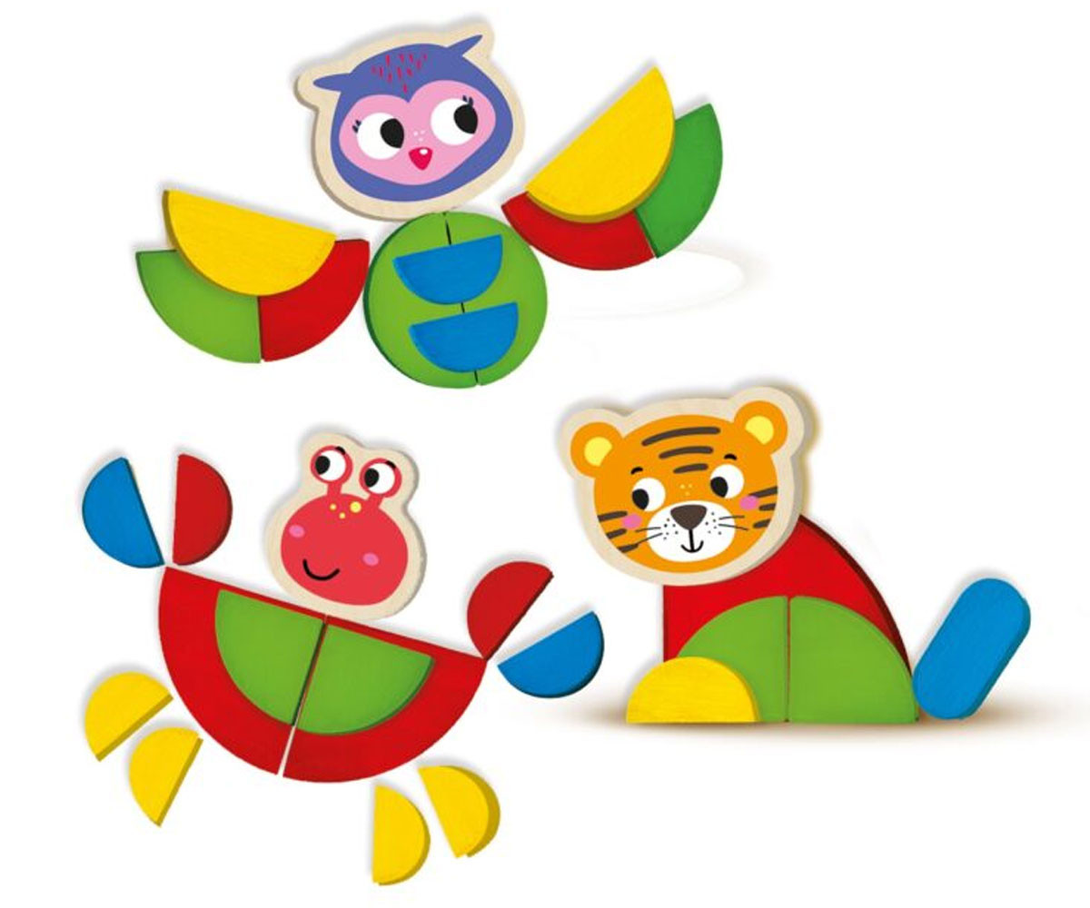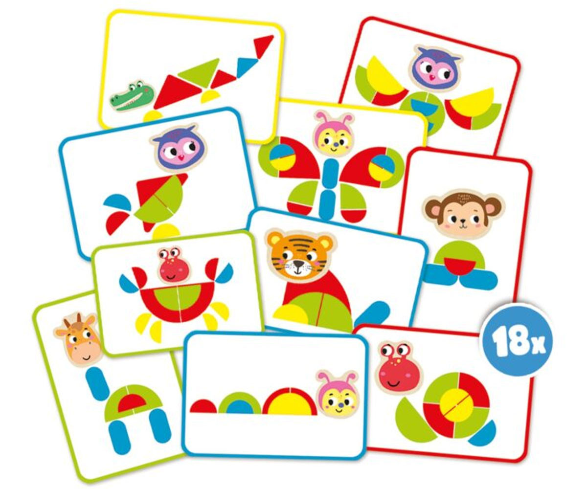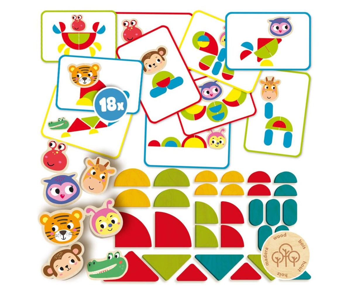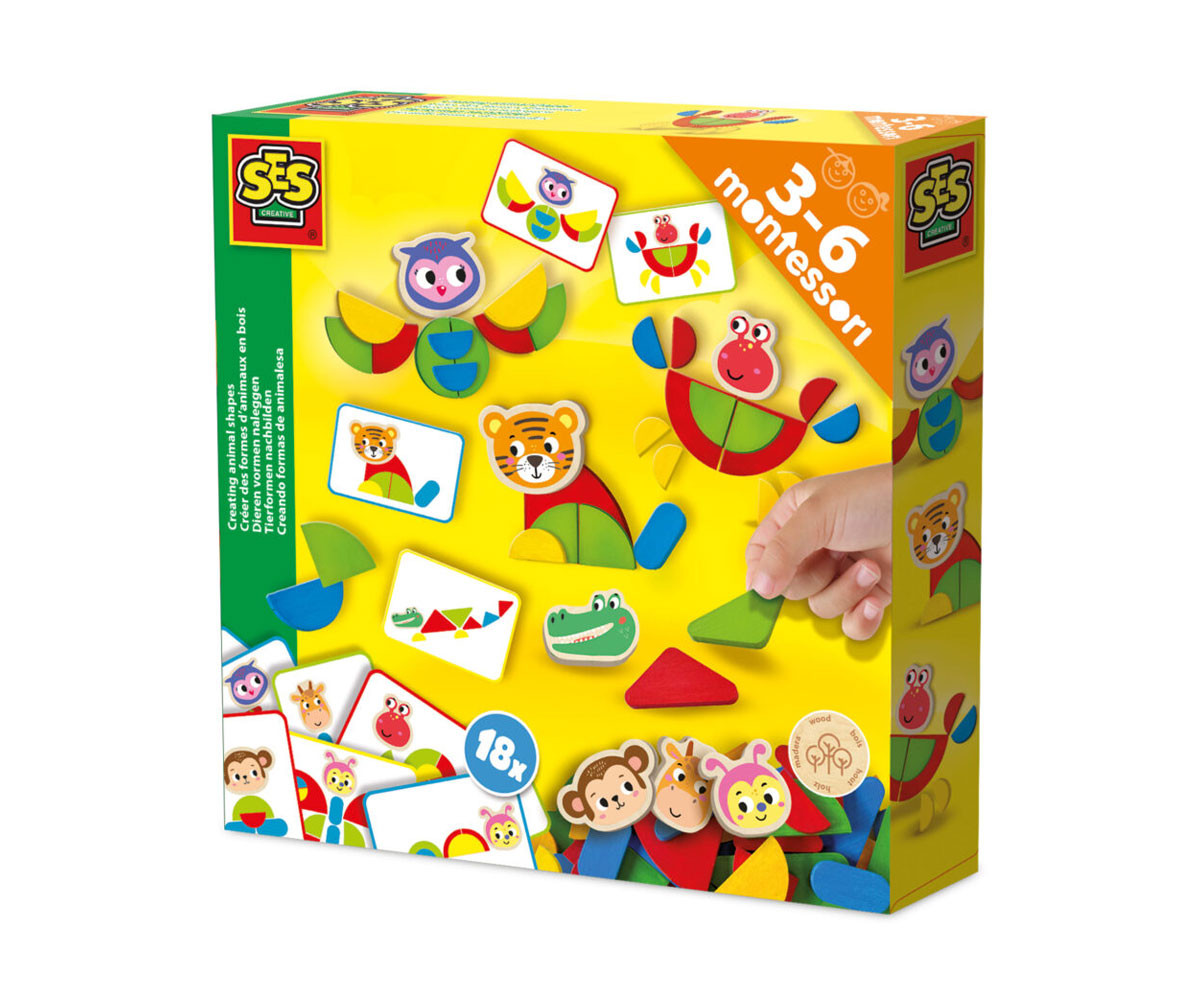 Открий „Монтесори – Създаване на животински форми“ – забавно и образователно занимание за деца от 3 до 6 години! Този комплект насърчава ученето чрез игра, като помага на децата да разпознават форми и развиват пространствено мислене. С включените дървени главички на животни, цветни елементи и карти за игра, децата могат да създават собствени животни и да се забавляват, докато учат.