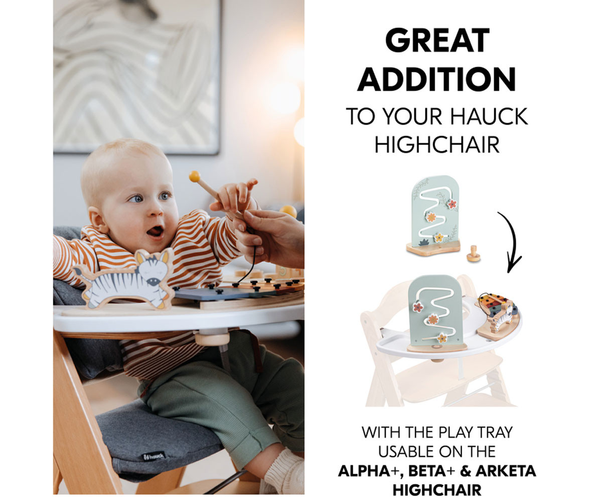 Искате ли да позволите на детето си да се наслаждава на забавления и игри в стола за хранене? С Play Planting S вашето малко съкровище може да избутва цветя, колкото си поиска. А после да ги пуска обратно надолу. Щастливо настроение гарантирано! Хващане, бутане, пускане: Play Planting S насърчава детето ви да играе, като развива координацията ръка-око – бързо постигнато усещане за успех! Искате да свършите нещо, като същевременно държите под око детето си? Това перфектно допълнение към таблата за игра (не е включена, можете да я закупите тук) на вашия Alpha+, Beta+ или Arketa ще държи детето ви заето, когато играе само. Подвижните цветя се движат по релса. Просто завивате играчката към таблата за игра (не е включена, можете да я закупите тук) на стола за хранене. Това означава, че нищо няма да падне. Дали в стола за хранене или на пода: с Play Planting S вашето дете може да играе навсякъде. Тъй като работи отлично както с, така и без таблата за игра на hauck. Обичате природата? И ние я обичаме. Затова нашето Play Planting S е изработено от устойчива дървесина с FSC® сертификат. Можете да разчитате на това!