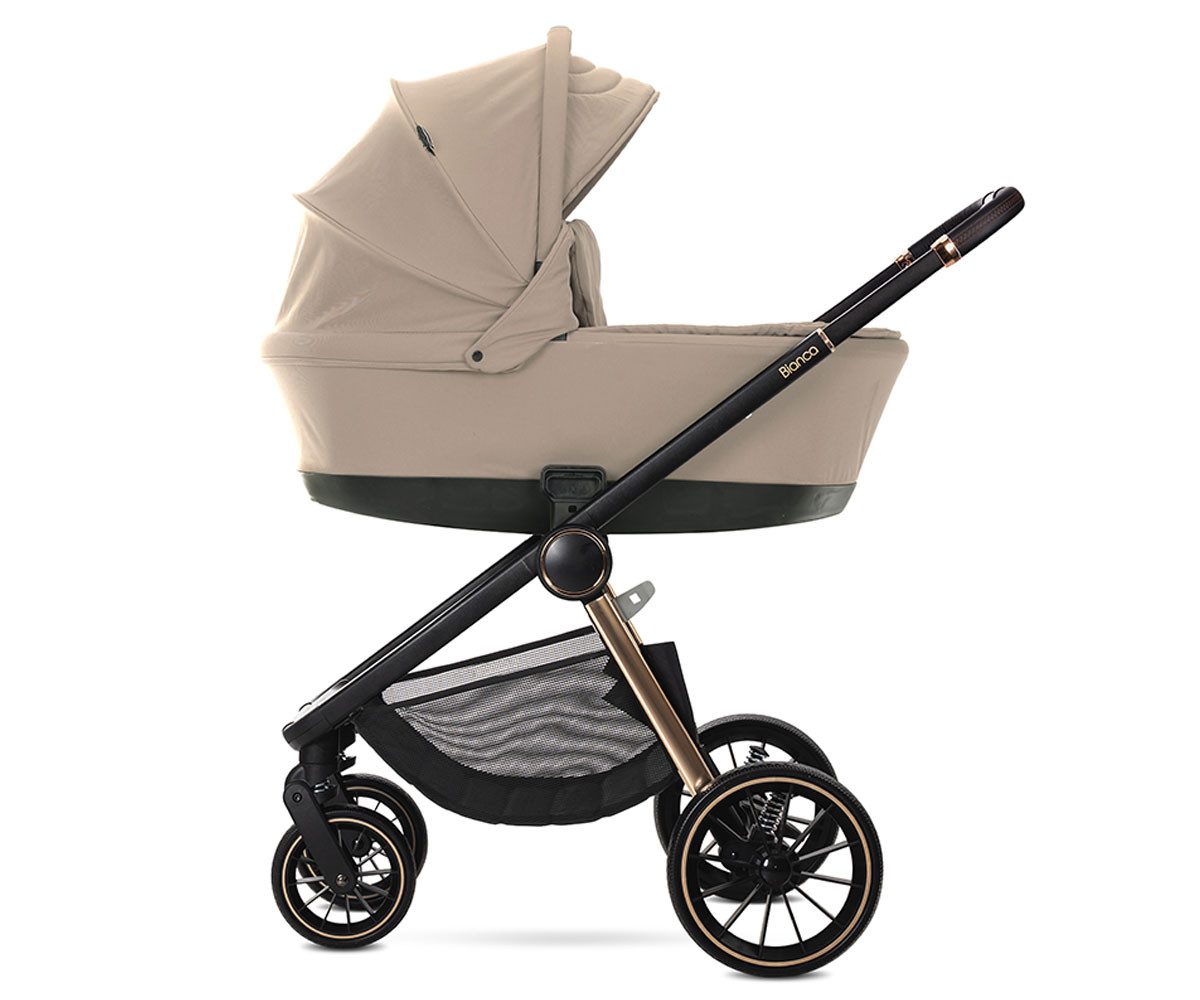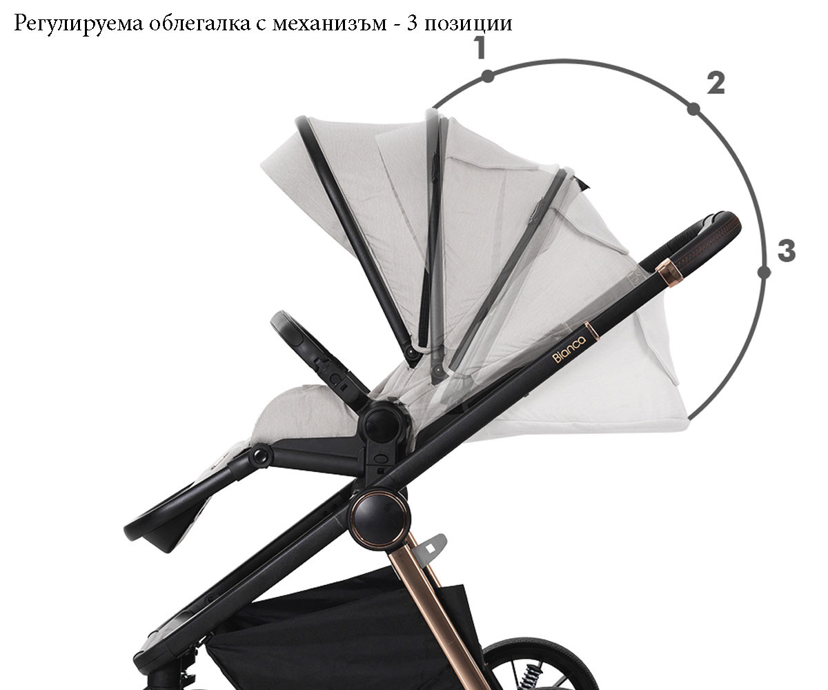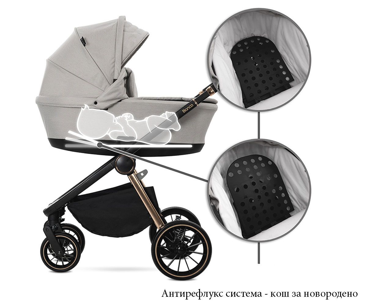 Бебешката комбинирана количка 3в1 Bianca включва: рама, кош за новородено, седалка, столче за кола-кошница (40-87см), адаптори и чанта/раница за аксесоари.