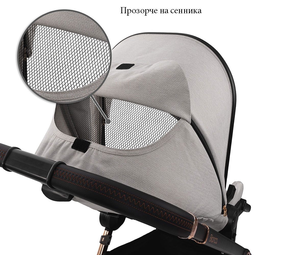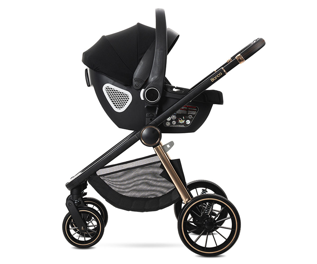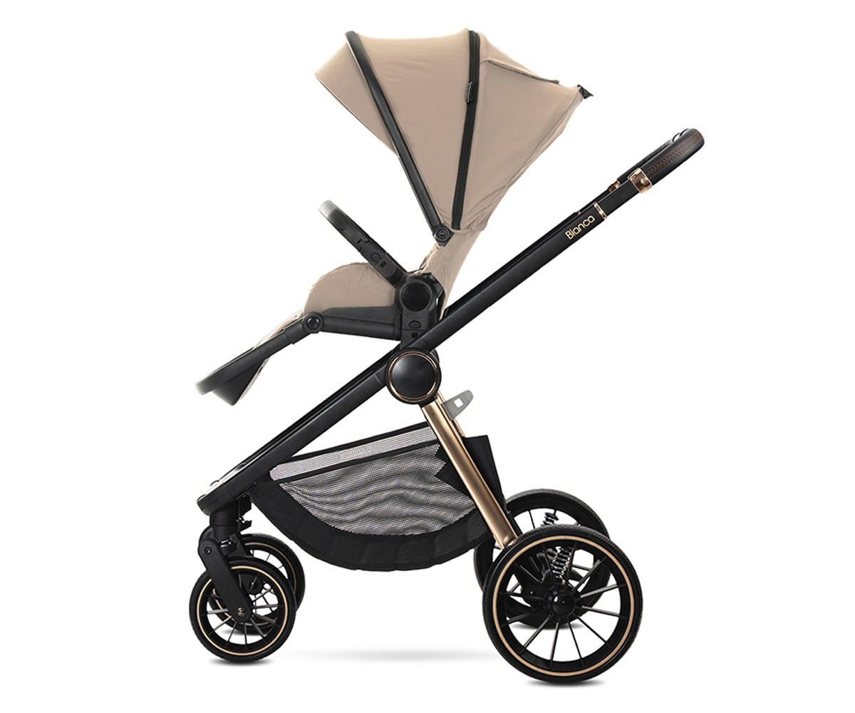 Бебешката комбинирана количка 3в1 Bianca включва: рама, кош за новородено, седалка, столче за кола-кошница (40-87см), адаптори и чанта/раница за аксесоари.