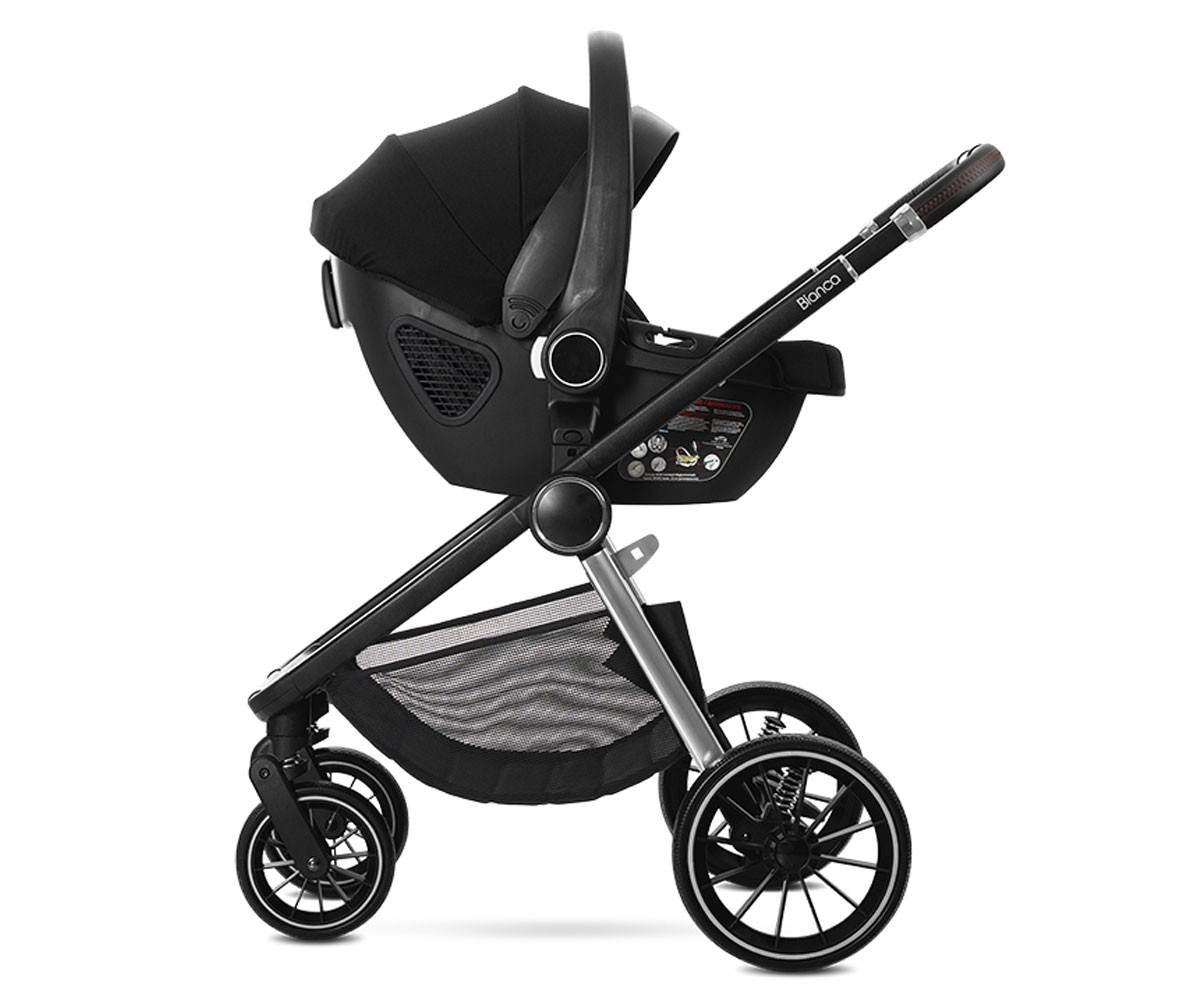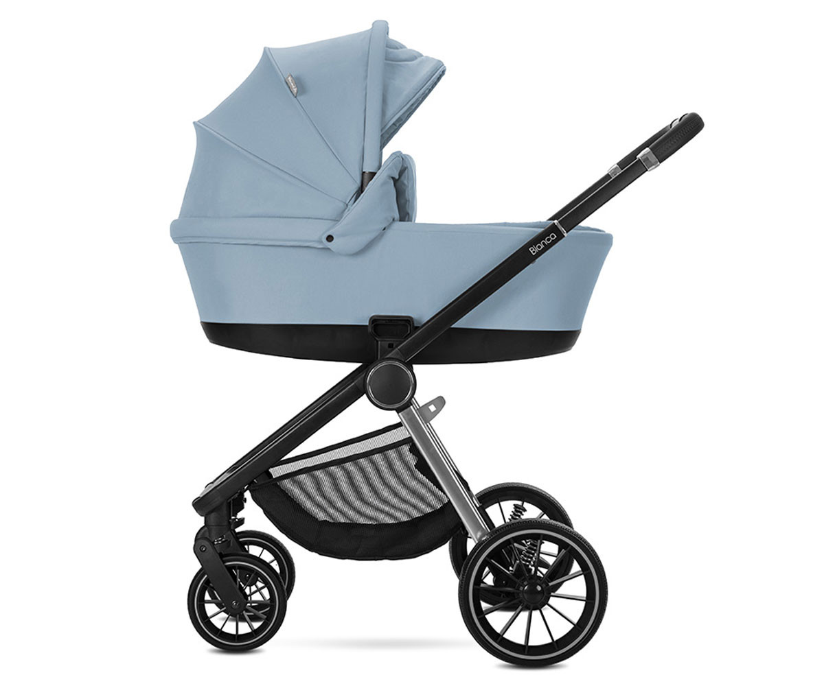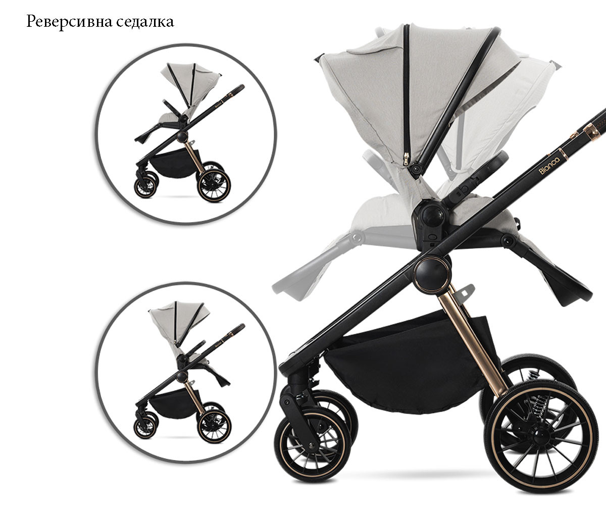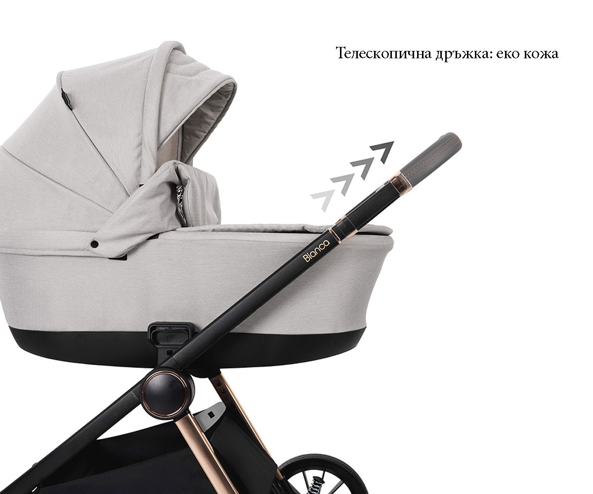 Бебешката комбинирана количка 3в1 Bianca включва: рама, кош за новородено, седалка, столче за кола-кошница (40-87см), адаптори и чанта/раница за аксесоари.