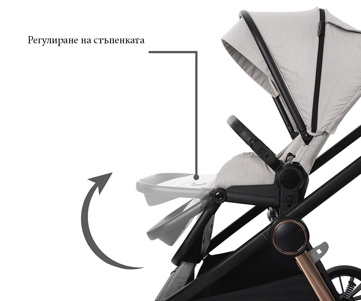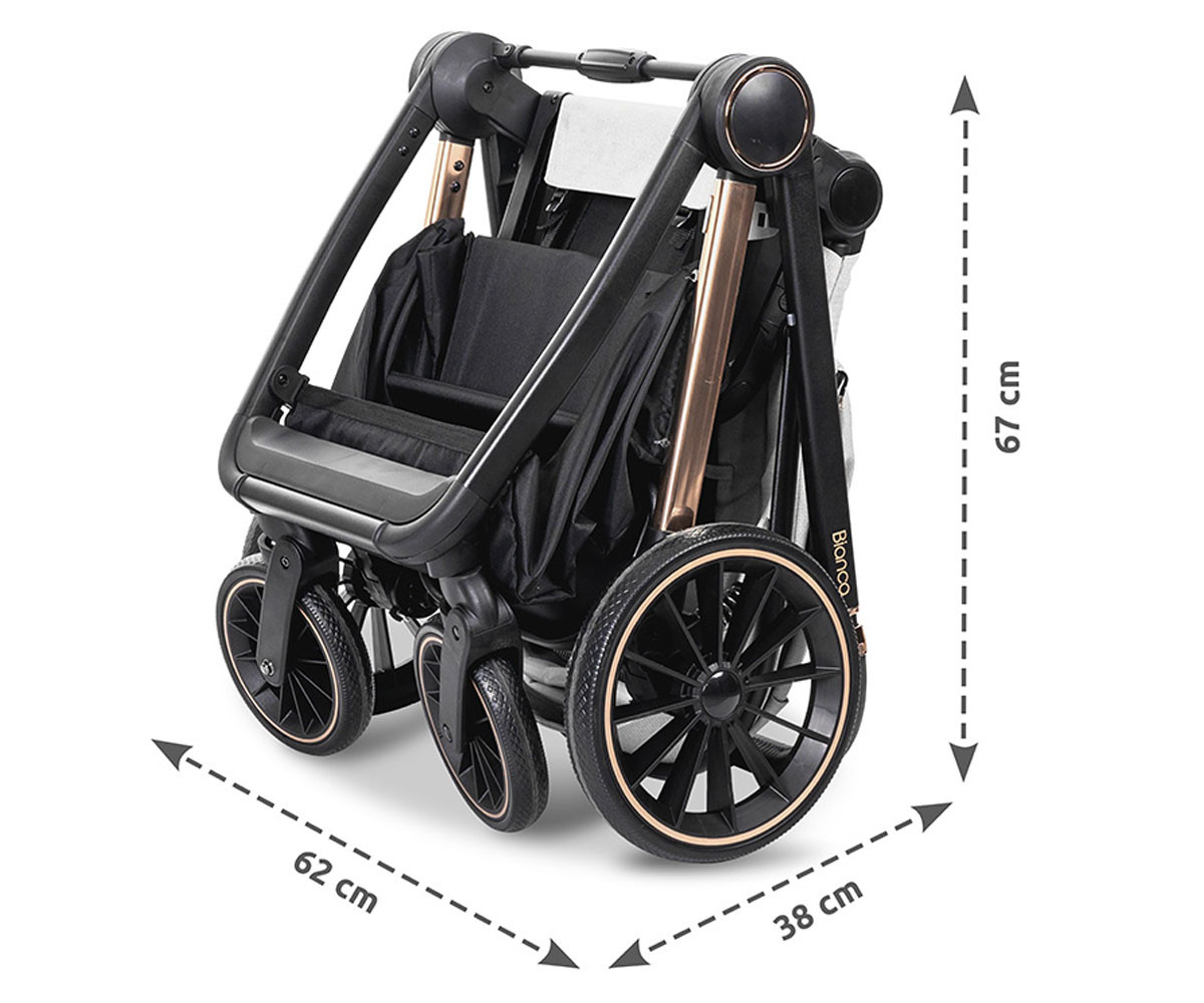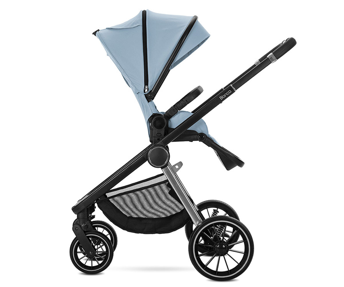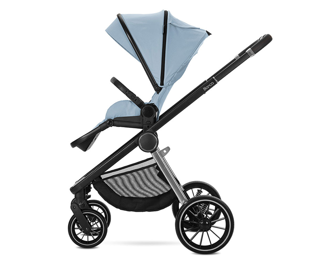 Бебешката комбинирана количка 3в1 Bianca включва: рама, кош за новородено, седалка, столче за кола-кошница (40-87см), адаптори и чанта/раница за аксесоари.