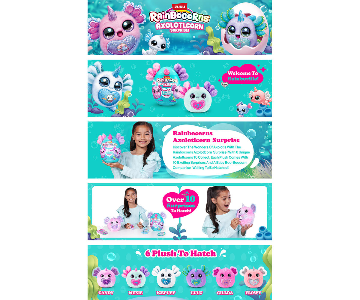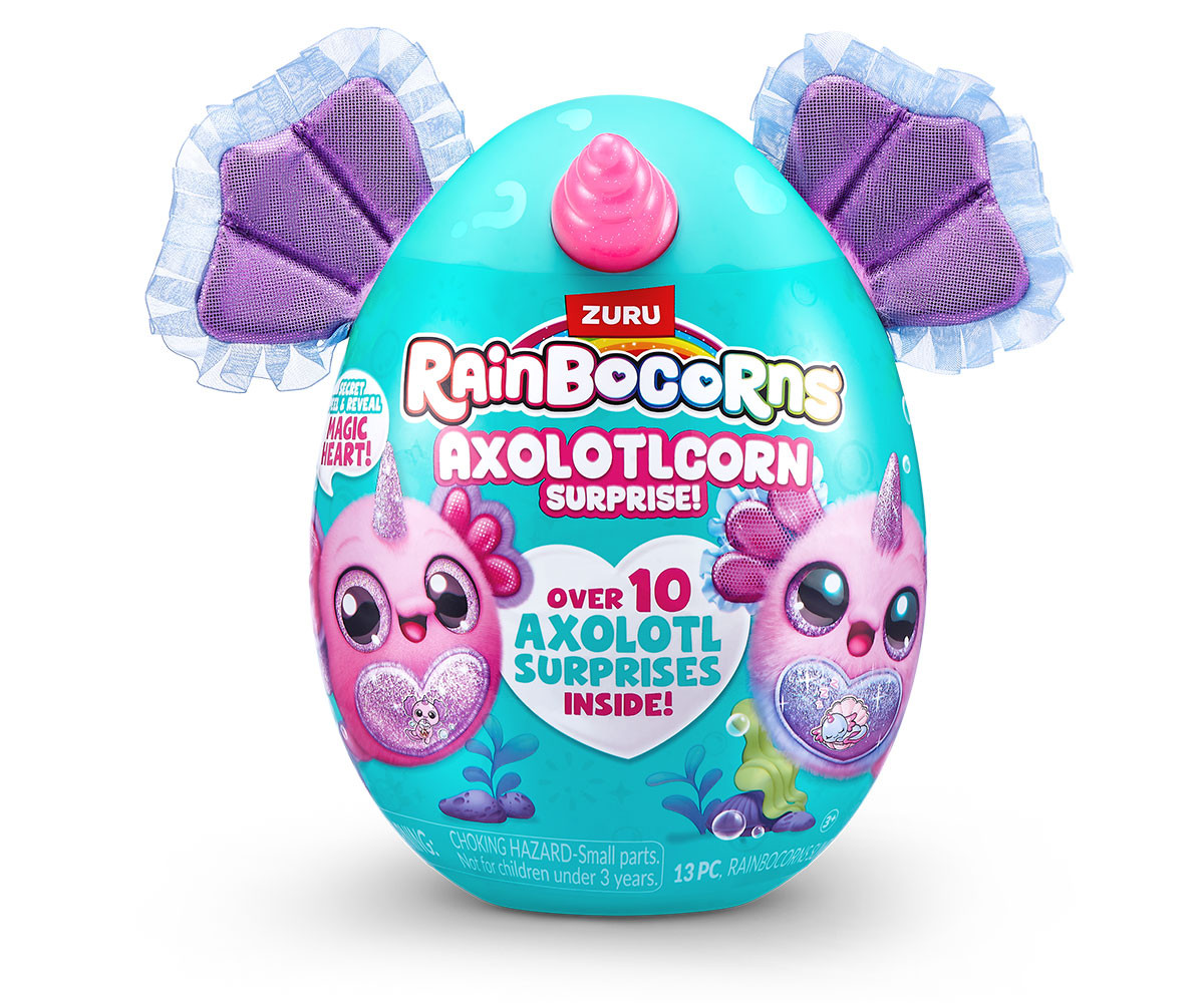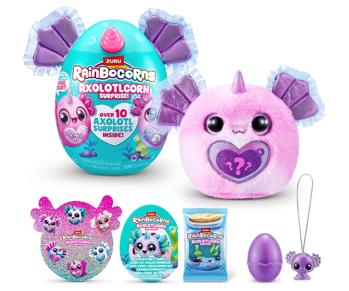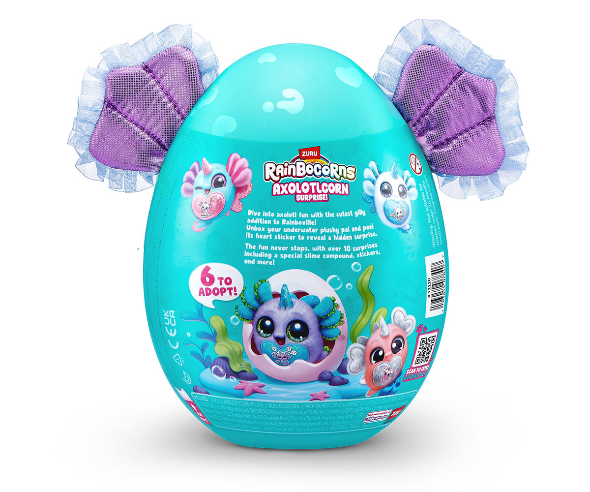 Открий вълшебния свят на аксолотлите с най-новото попълнение в Rainboville – Rainbocorns Axolotlcorn Surprise! Всяка сладка плюшена играчка Axolotlcorn идва с 10 тематични изненади, включително бебе Boo-Boocorn, което чака да бъде излюпено! Събери и прегърни всичките 6 уникални Axolotlcorns и се потопи в магически свят, изпълнен с приключения, обич и меки прегръдки. Счупи яйцето, за да откриеш новото си плюшено приятелче – аксолотъл, готово за игра и колекциониране!