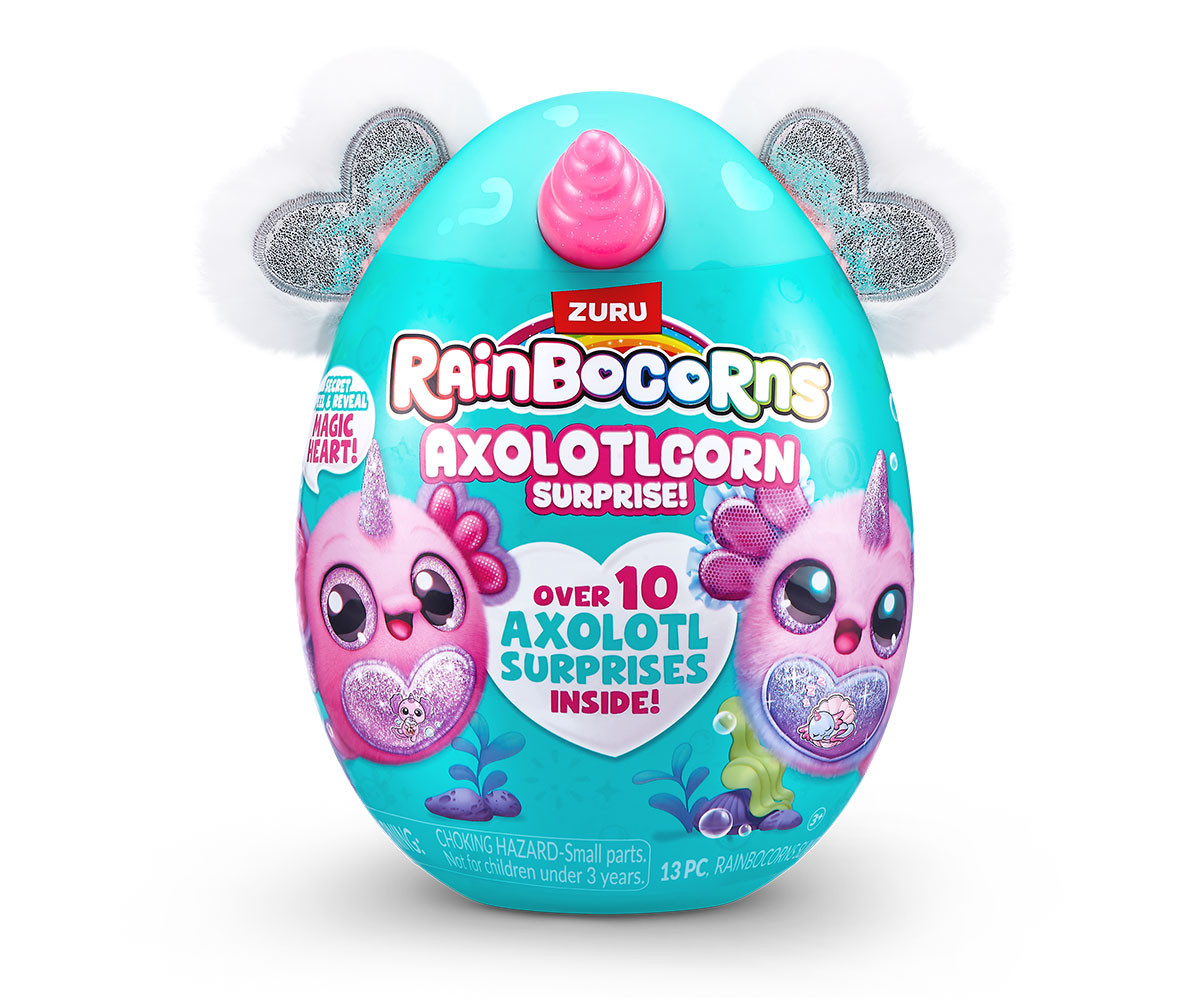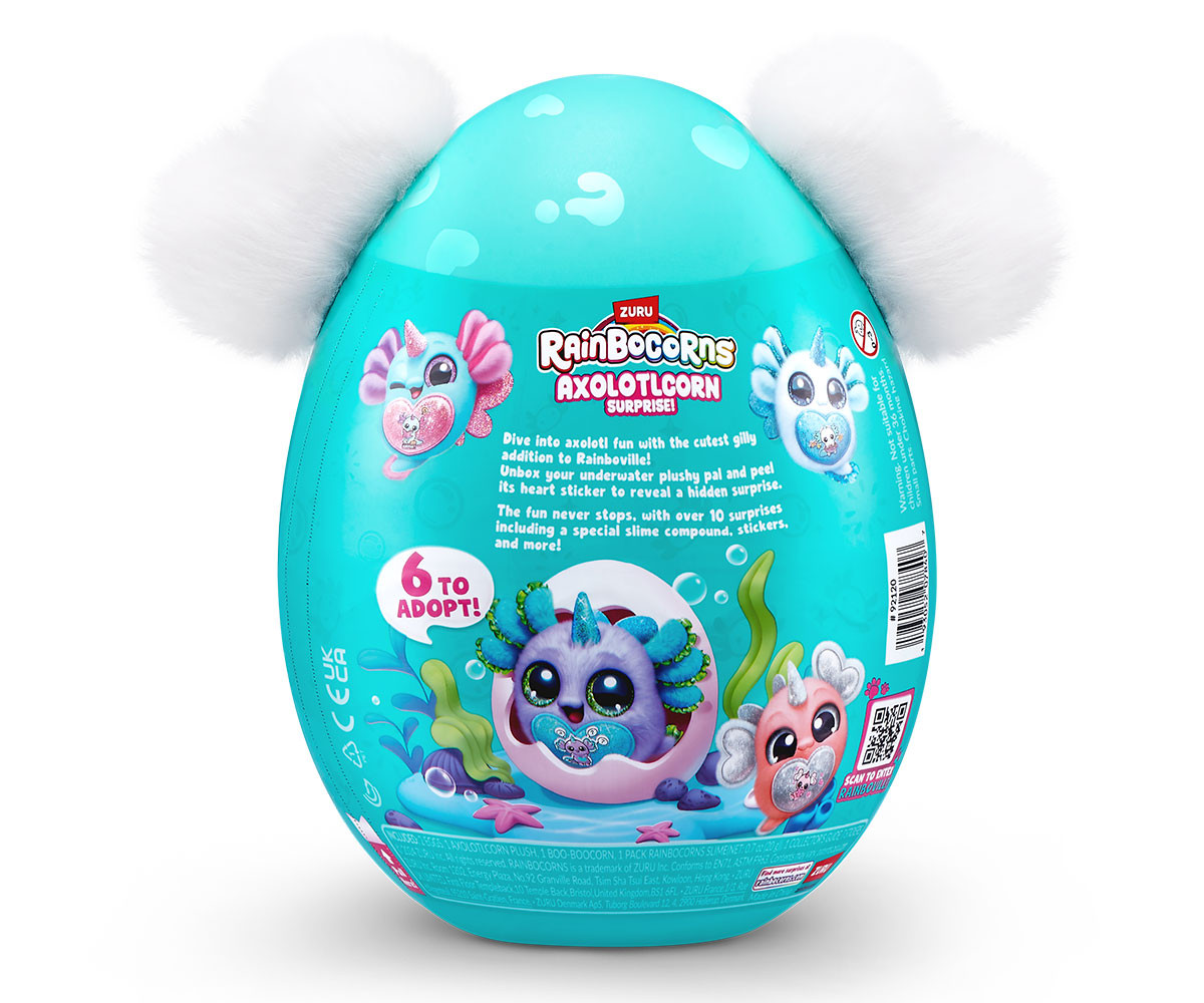 Открий вълшебния свят на аксолотлите с най-новото попълнение в Rainboville – Rainbocorns Axolotlcorn Surprise! Всяка сладка плюшена играчка Axolotlcorn идва с 10 тематични изненади, включително бебе Boo-Boocorn, което чака да бъде излюпено! Събери и прегърни всичките 6 уникални Axolotlcorns и се потопи в магически свят, изпълнен с приключения, обич и меки прегръдки. Счупи яйцето, за да откриеш новото си плюшено приятелче – аксолотъл, готово за игра и колекциониране!
