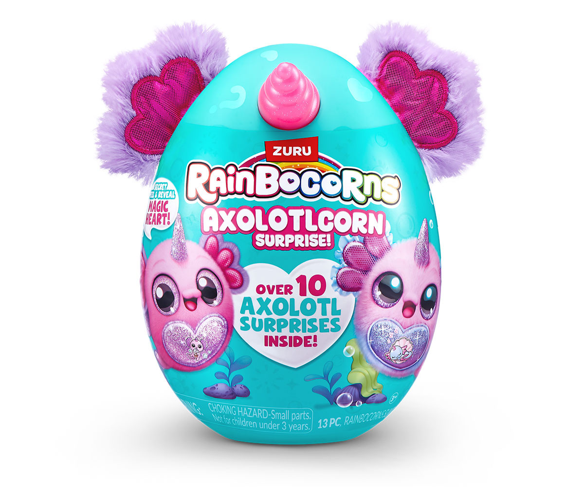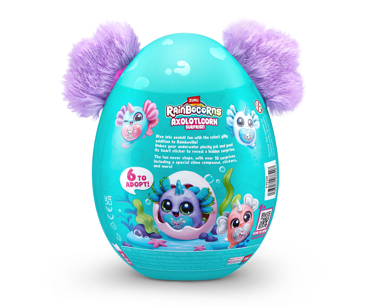 Открий вълшебния свят на аксолотлите с най-новото попълнение в Rainboville – Rainbocorns Axolotlcorn Surprise! Всяка сладка плюшена играчка Axolotlcorn идва с 10 тематични изненади, включително бебе Boo-Boocorn, което чака да бъде излюпено! Събери и прегърни всичките 6 уникални Axolotlcorns и се потопи в магически свят, изпълнен с приключения, обич и меки прегръдки. Счупи яйцето, за да откриеш новото си плюшено приятелче – аксолотъл, готово за игра и колекциониране!