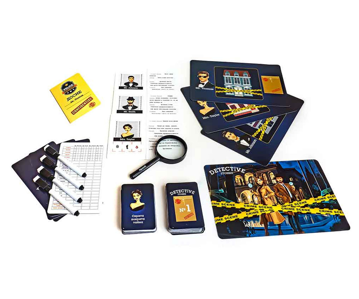 „Детективни истории“ ще ви потопи в атмосферата на малко швейцарско градче от миналото, където е извършено мистериозно убийство на уважаван колекционер – господин Харис. Играчите ще разследват случая, разглеждайки досиетата на четирима заподозрени, за да открият кой е извършил престъплението. По време на играта ще се анализират мотивите, отношенията с жертвата, доказателствата от местопрестъплението, както и навиците, здравословното състояние и психологическият профил на заподозрените. Подходяща за 2–4 участници над 12 години, играта развива логика, концентрация и памет. Благодарение на над 2 милиона възможни развоя, тя предлага различен сценарий всеки път.