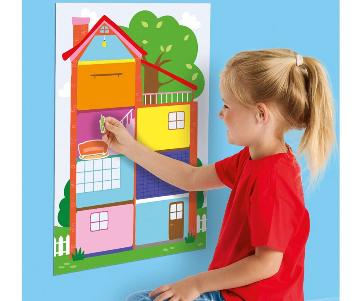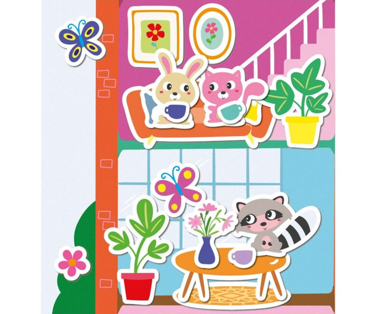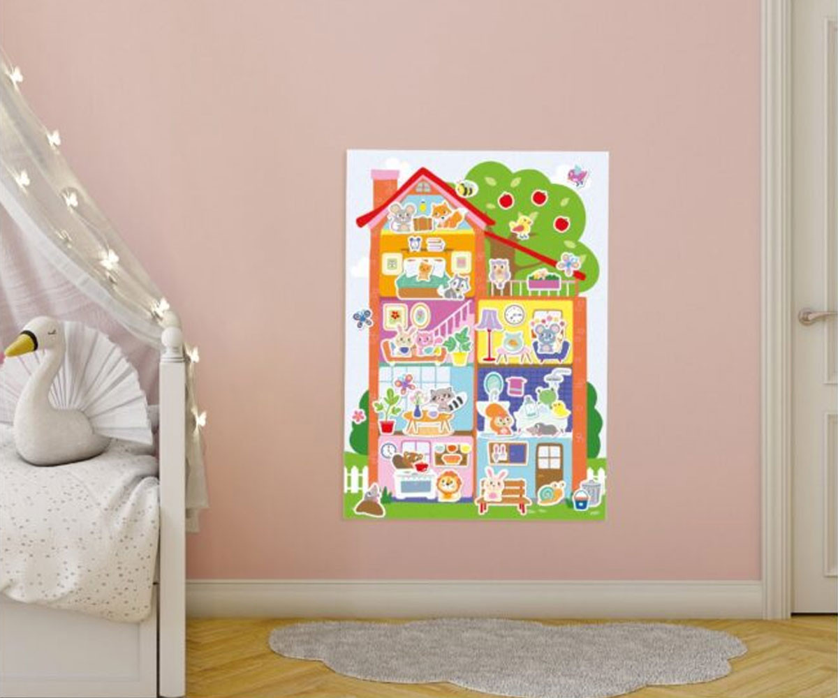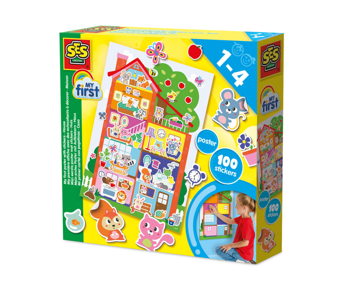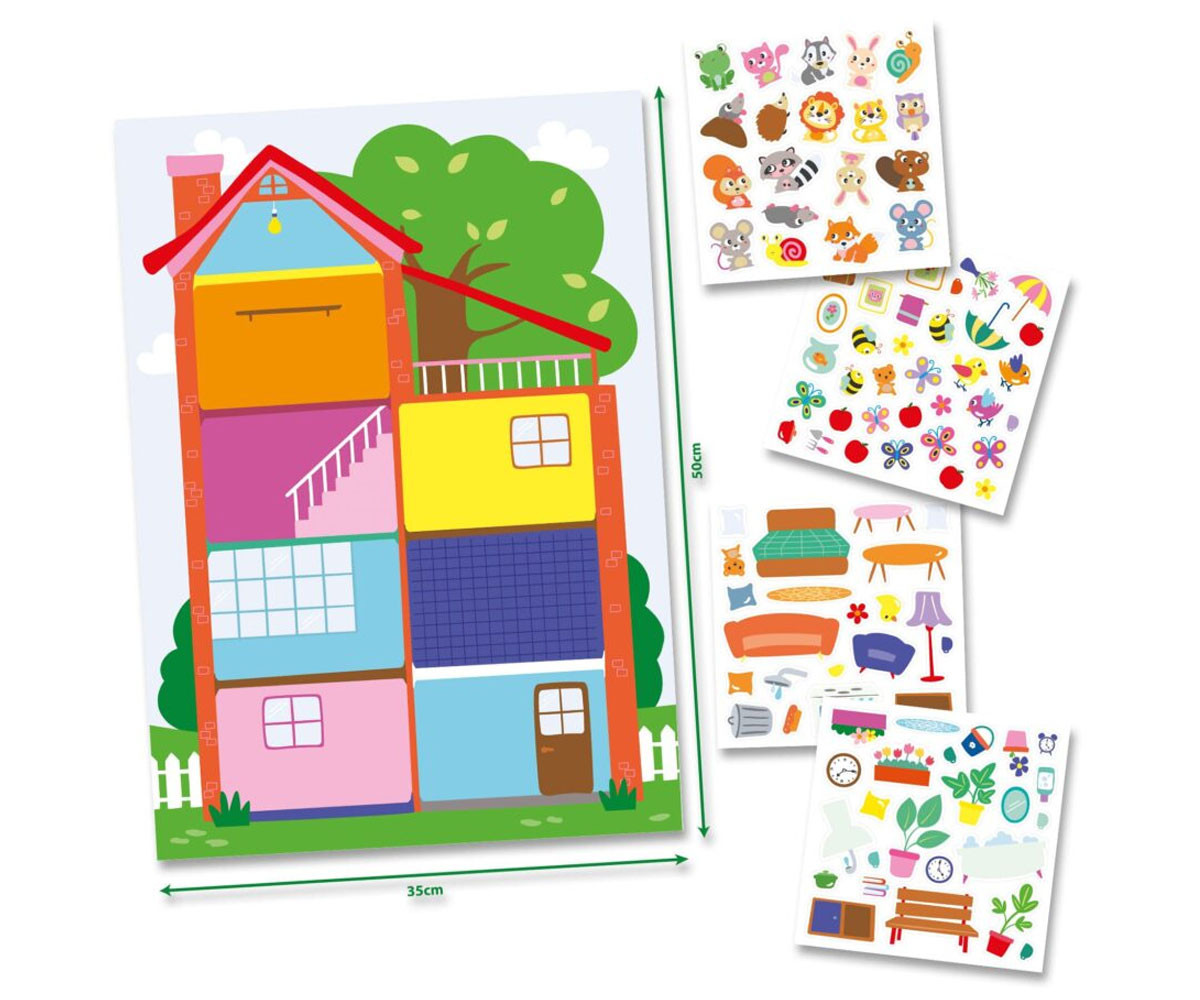 Открийте My First Плакат със стикери, забавна дейност за малчуганите! Декорирайте къщата със стикери като мебели и весели животни и ги залепете на големия отпечатан плакат (с размер 49.5 x 35 см). Със 100 стикера с животни, мебели и декорации можете да създадете уютен интериор за къщата!