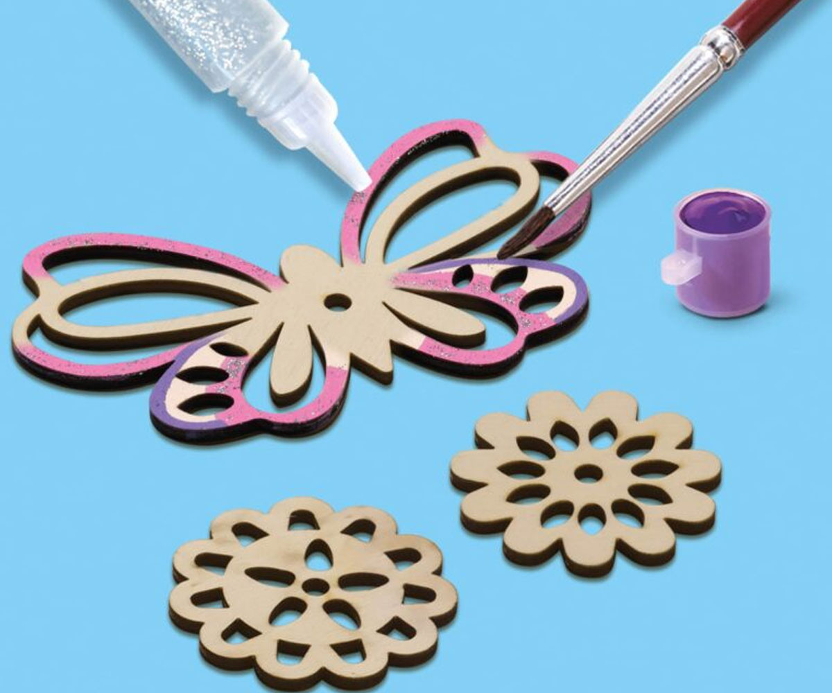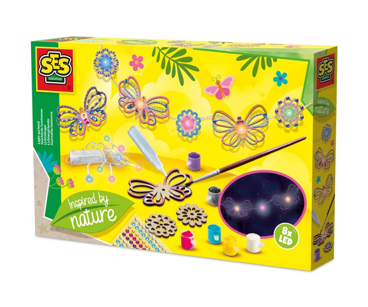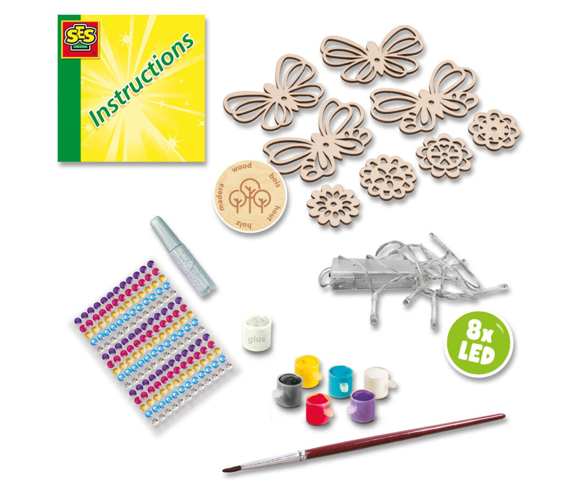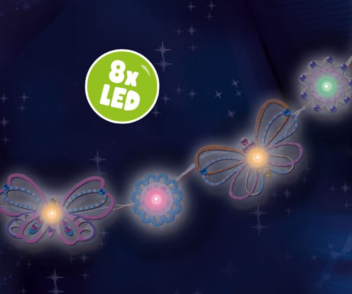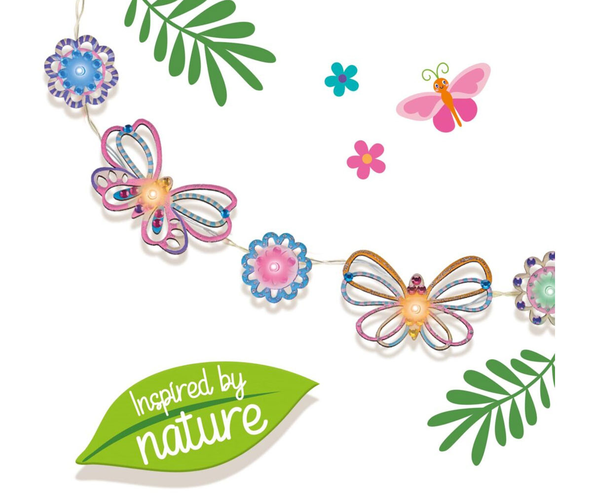 Създай своя вълшебен Светещ гирлянд – Вдъхновен от природата! Декорирай 8 дървени пеперуди и цветя с помощта на 6 модерни цвята боички, сребърен брокатен гел и самозалепващи диамантени стикери в 5 цвята. Закрепи фигурките към гирлянда със 8 цветни LED светлини, за да създадеш вълшебен и блестящ ефект. Комплектът съдържа всичко необходимо за създаването на твоята приказна светлинна декорация – включително четка, лепило и инструкции. Забележка: Работи с батерии (2x AA) не са включени.