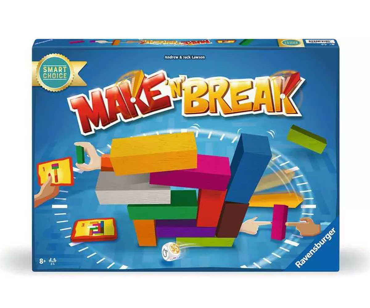 Make 'n' Break от Ravensburger е идеалната семейна настолна игра за безкрайни часове забавление и креативност! Изграждайте цветни постройки заедно в състезание с времето! Вълнуващо предизвикателство за цялото семейство! Съдействайте си във вечно променящи се отбори, но помнеете - само един играч ще бъде победител! Това издание съдържа над 100 проекта, плюс изцяло ново екшън зарче с 5 изобретателни варианта за още по-увлекателна игра!