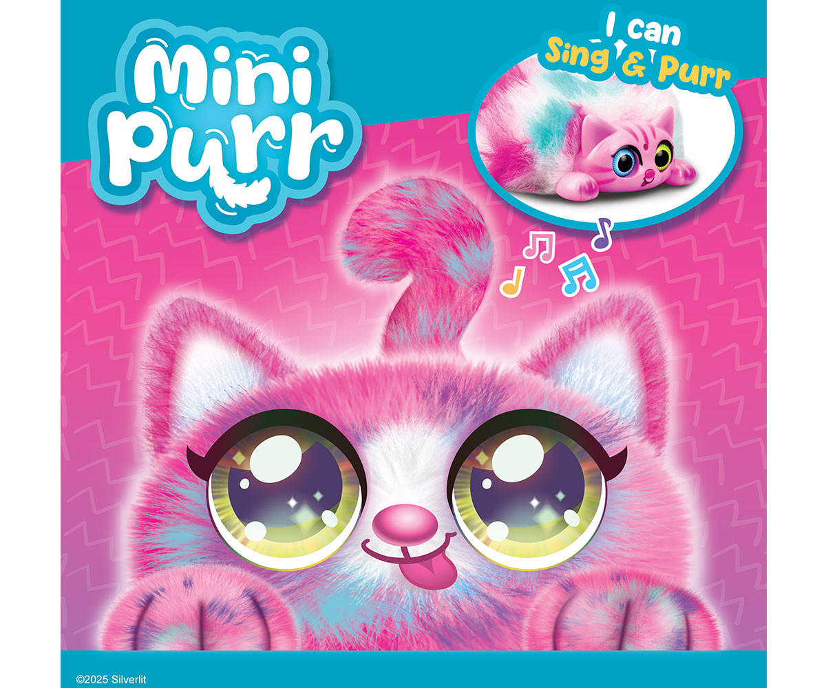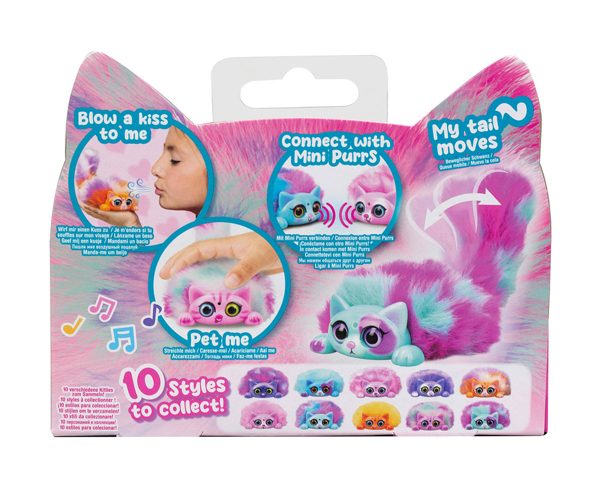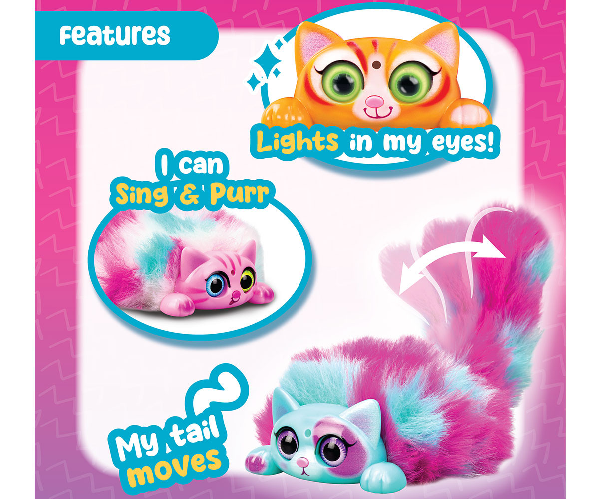 MINI PURR е интерактивно котенце – пухкав домашен любимец на батерии. Играй с MINI PURR, като го погалиш по главичката или натиснеш нослето му, за да активираш светлинни и звукови ефекти. Очичките му ще светят, докато издава сладки звуци в отговор на твоя допир. Дръпни лостчето, за да раздвижиш пухкавата му опашка. Можеш също да духнеш въздух в личицето му и ще видиш очарователните му реакции! MINI PURR може да се свързва и с други от серията, за да пеят заедно като хор. Налични са 6 различни цвята и стила, които можеш да събираш. Препоръчителна възраст: 3+ години.