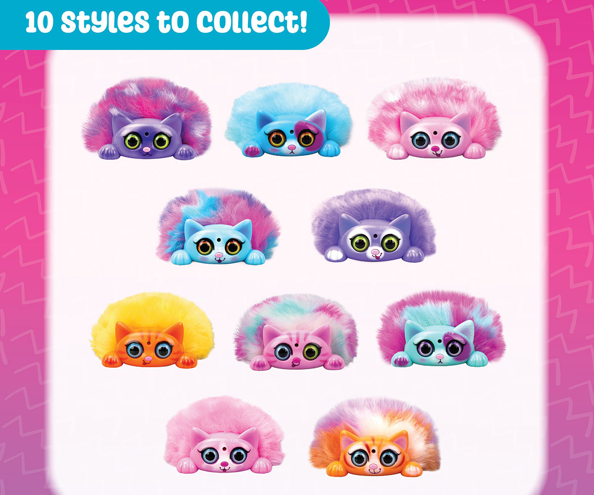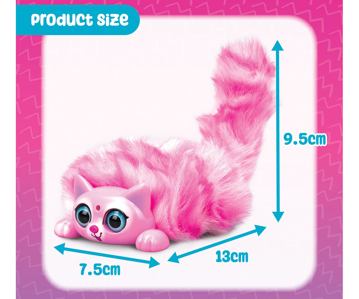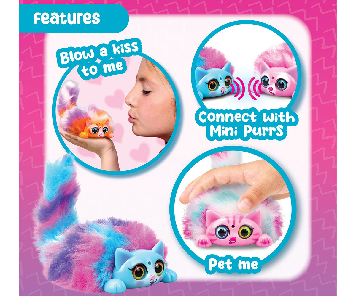 MINI PURR е интерактивно котенце – пухкав домашен любимец на батерии. Играй с MINI PURR, като го погалиш по главичката или натиснеш нослето му, за да активираш светлинни и звукови ефекти. Очичките му ще светят, докато издава сладки звуци в отговор на твоя допир. Дръпни лостчето, за да раздвижиш пухкавата му опашка. Можеш също да духнеш въздух в личицето му и ще видиш очарователните му реакции! MINI PURR може да се свързва и с други от серията, за да пеят заедно като хор. Налични са 6 различни цвята и стила, които можеш да събираш. Препоръчителна възраст: 3+ години.