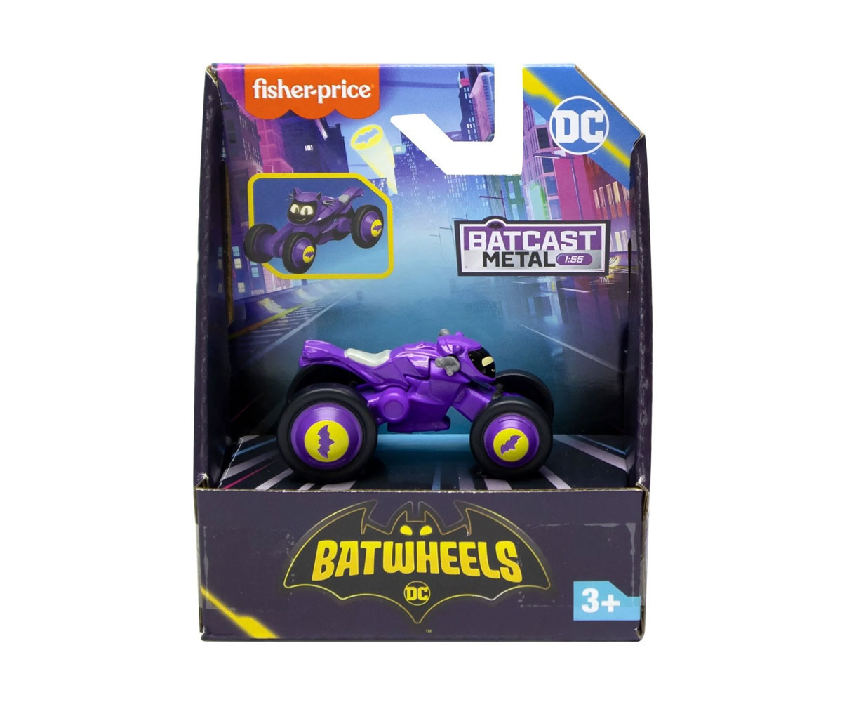Децата в предучилищна възраст могат да участват във вълнуващи приключения за борба с престъпността, точно като в анимационния филм, с тази колекция от ляти коли Batwheels™ от Fisher-Price®. Всяко превозно средство в мащаб 1:55 има автентичен стил на героите Batwheels™, отляти под налягане материали Batcast Metal™ и истински въртящи се колела, така че младите бойци с престъпност да могат да изпратят любимите си DC превозни средства да се отзоват на помощ! Децата могат да ги съберат всички. (Продават се отделно в зависимост от наличността.)