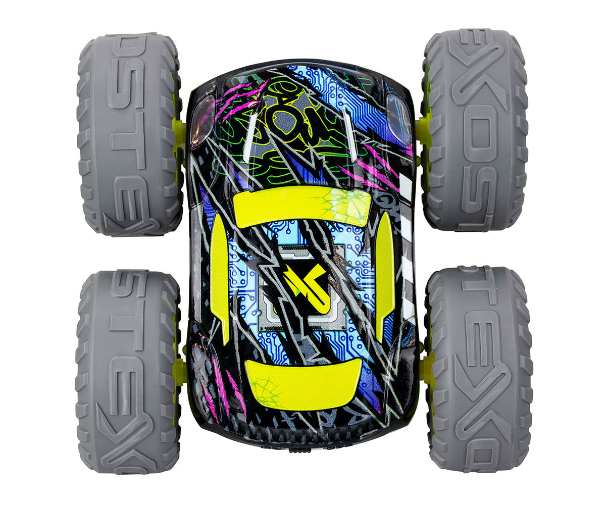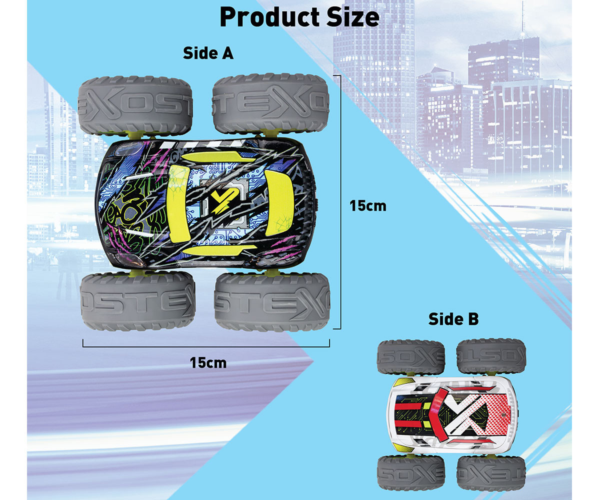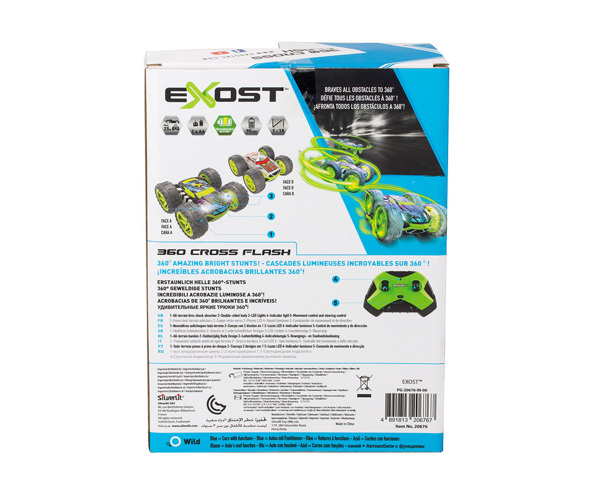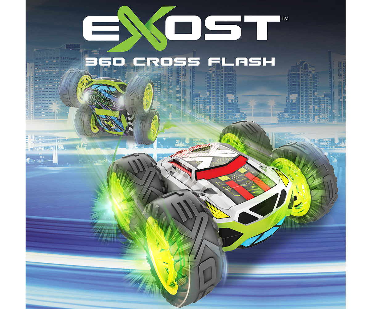 360° CROSS FLASH пристига със светлинна буря! Със зашеметяващи светлинни ефекти на четирите колела и предни фарове, 360 CROSS FLASH може да прави преобръщания и каскади със стил! Превозното средство е двустранно, с уникален EXOST градски дизайн от всяка страна – достатъчно, за да изразиш двойната си EXOST нагласа. 360° CROSS FLASH е оборудвано с презареждаща се батерия, която се зарежда удобно и лесно.