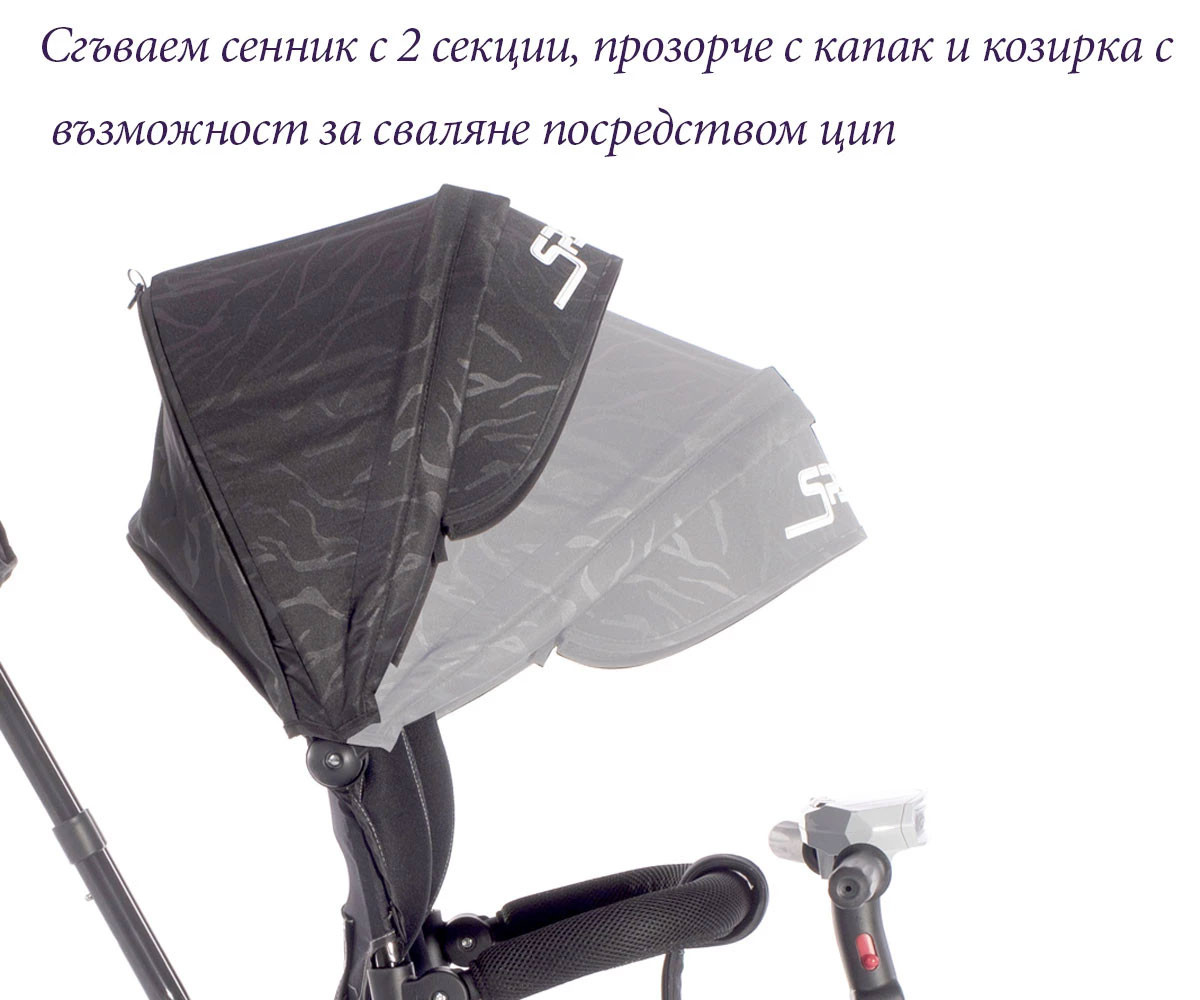 - Съваем сенник с 2 секции, прозорче с капак и козирка с възможност за сваляне Посредством цип;