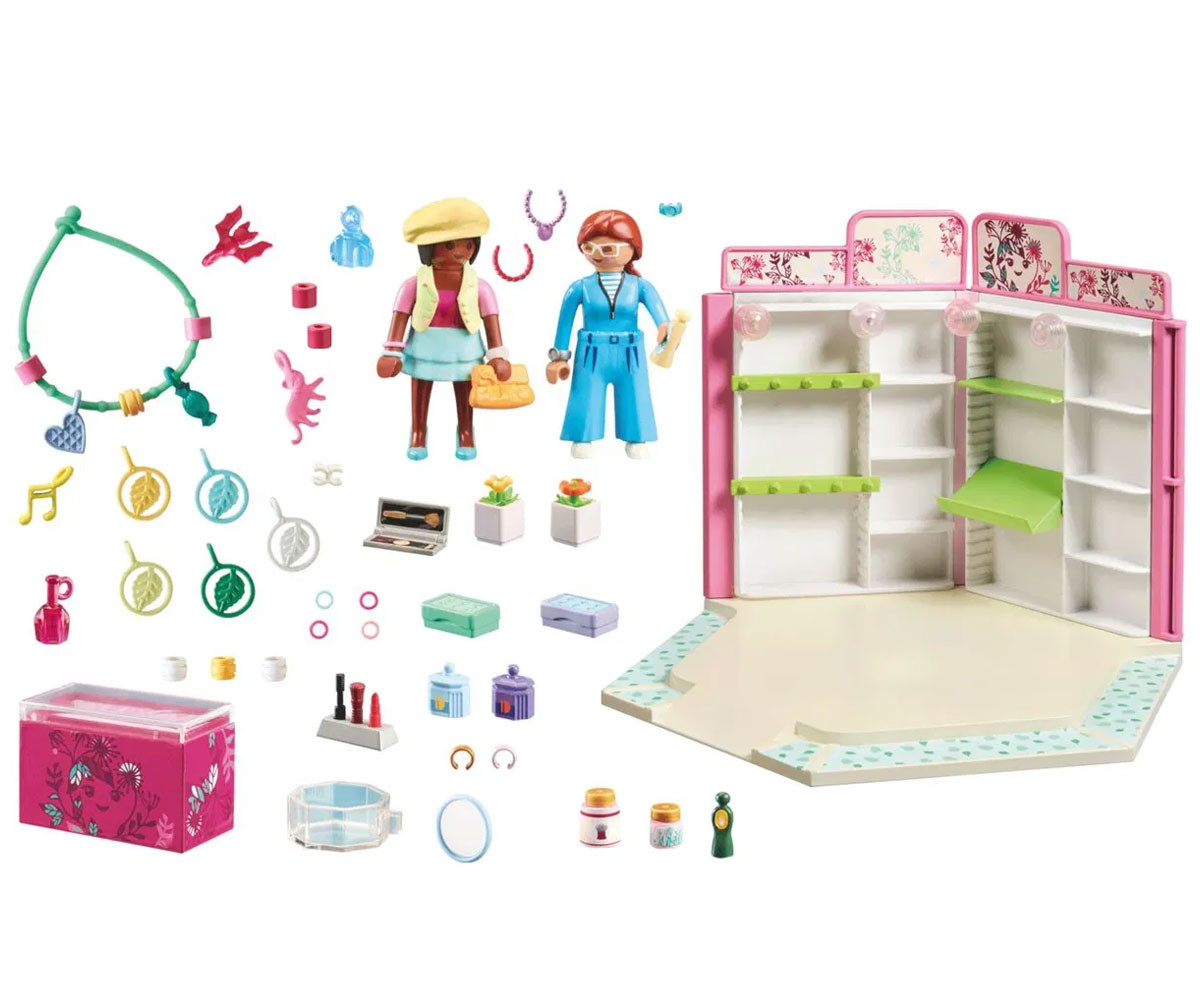 - Обичливо проектиран Бутик за красота с две фигурки PLAYMOBIL, витрина, кутийки, гривни, цветни звезди, червило и всякакви други аксесоари за грим и бижута;