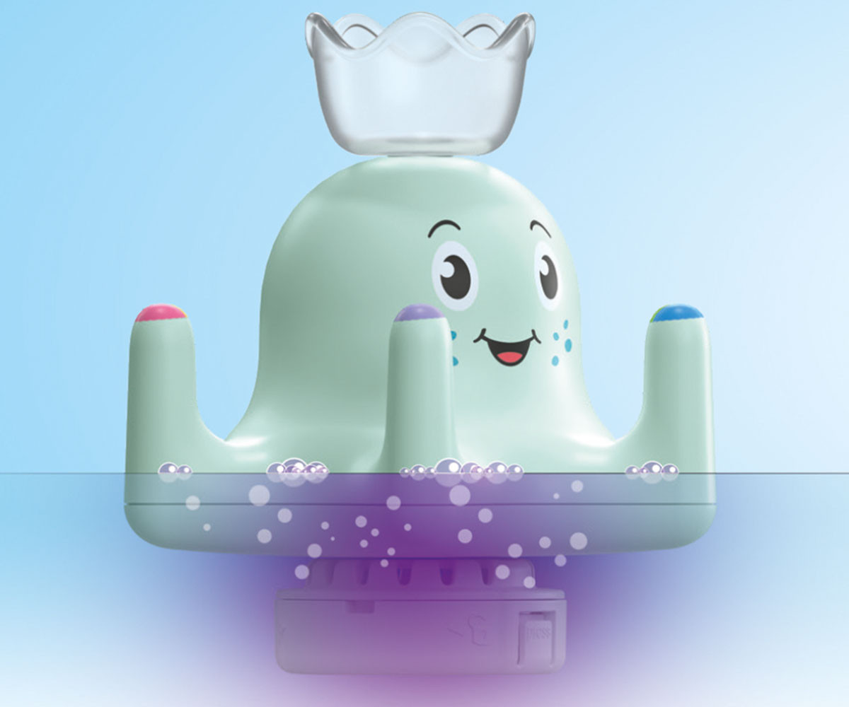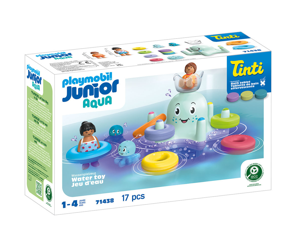 Готови, на старта, СТАРТ! Кой ще бъде първият в банята? С невероятните нови комплекти за вана в сътрудничество с Tinti, времето за баня става още по-забавно! Тук можете да се насладите на прекрасни моменти във ваната с три различни цветни таблетки за баня от Tinti, които оцветяват водата и я правят приятно ароматна. Какъв е любимият цвят на вашето дете за водата в банята? Нека разберем! Сега става цветно! Със забавния октопод, удоволствието от къпането е гарантирано. Неговите пипала са цветно отпечатани, а шестте ринга могат да бъдат прикрепени в съответстващи цветове. Малките бебета октоподи весело плуват във водата и фигурките бързо скачат в своите плувни рингове. Кой плува най-бързо? В кой цвят да бъде водата във ваната? Таблетката за баня Tinti може безопасно да се съхранява на дъното на октопода в специално отделение и водата става пенлива и ароматна. Любопитните откриватели могат да използват прозрачната чашка, за да изследват още по-добре цветната вода.